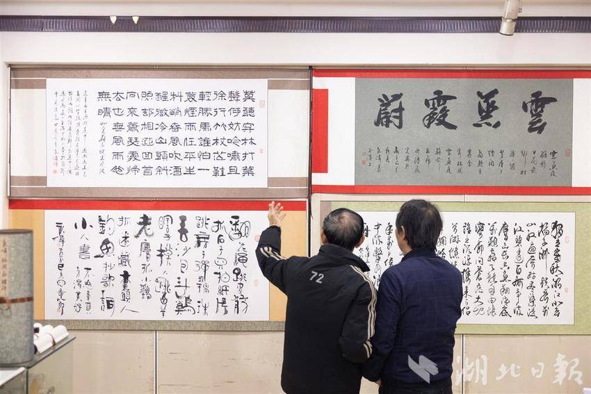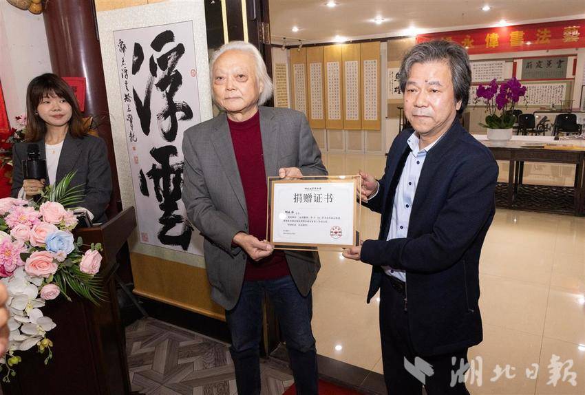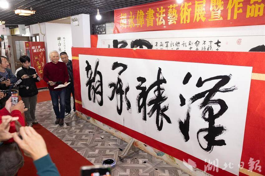 10月30日,“七秩翰墨颂风华·汉裱非遗映丹青”胡永伟书法展在武汉收藏品市场开幕。展览展出其70幅书法精品,并特别以非遗“汉裱”技艺精心装帧,展现了“画赖装潢以传”的艺术升华。开幕当天,胡永伟将50幅作品捐赠给湖北地质博物馆,搭建起艺术与科学对话的桥梁。展览将持续至11月6日,期间将举办公益讲座等系列活动。(湖北日报通讯员 桂巍 摄)