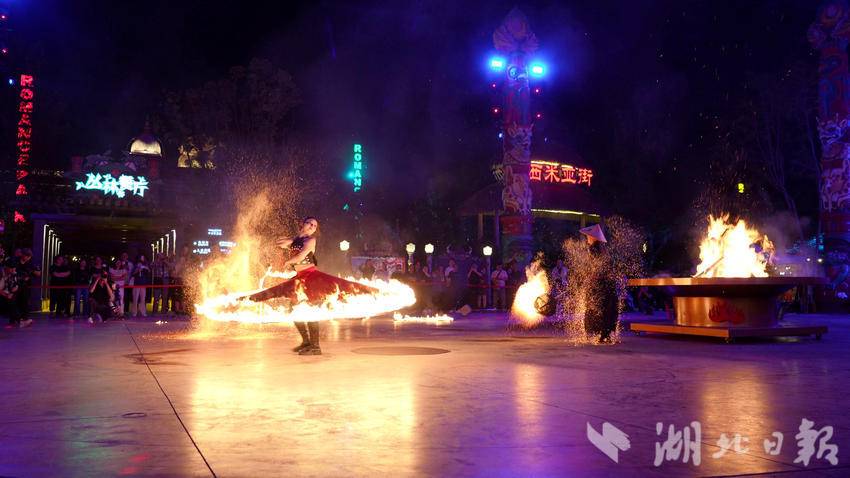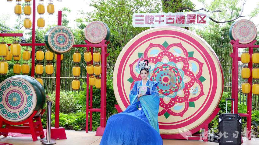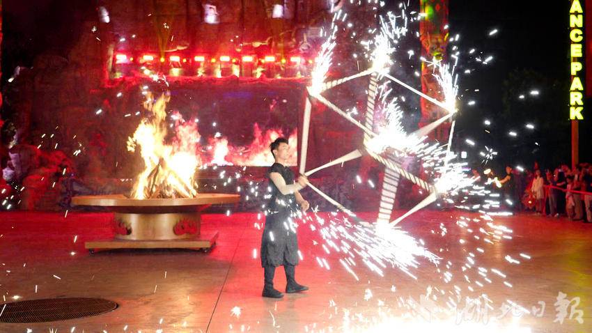 三峡千古情景区行政策划负责人吴孝俊介绍:“(我们)邀请了非常多的网红达人,以及‘李世民’的扮演者郑国霖老师来到线下,跟游客朋友们一起互动。(同时像)火壶、火裙、火棍、火立方等新的节目,引进到千古情景区里面来。”