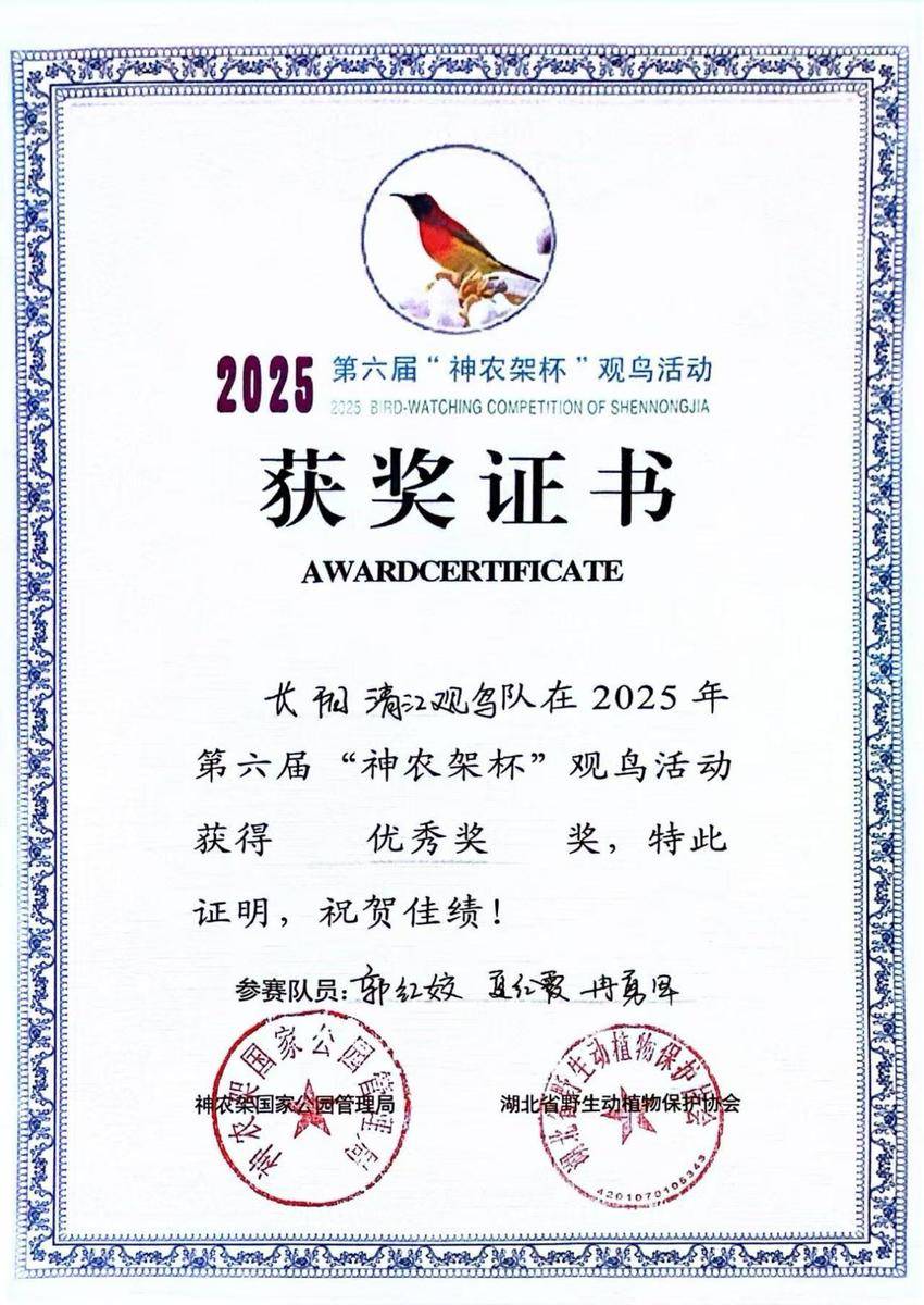 湖北日报客户端讯(通讯员习倩、冉勇军)2025年第六届“神农架杯”观鸟活动于10月28日圆满落幕。由长阳土家族自治县林业局、湖北长阳崩尖子省级自然保护区管理局组建的“长阳清江观鸟队”斩获优秀奖。