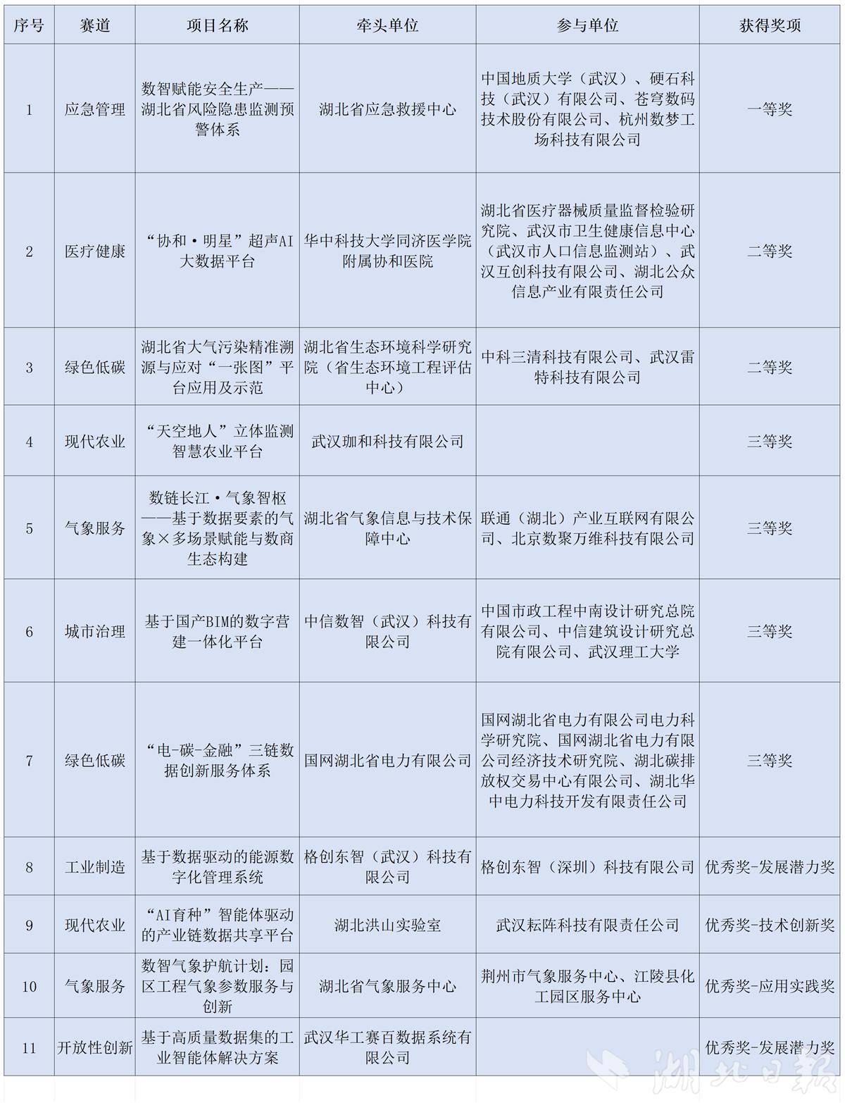 湖北日报讯(记者刘天纵、通讯员李青)今年“数据要素×”大赛全国总决赛,湖北共有11个项目获奖,获奖项目总数居全国第五,中部第一。其中,“数智赋能安全生产——湖北省风险隐患监测预警体系”项目获应急管理赛道一等奖。