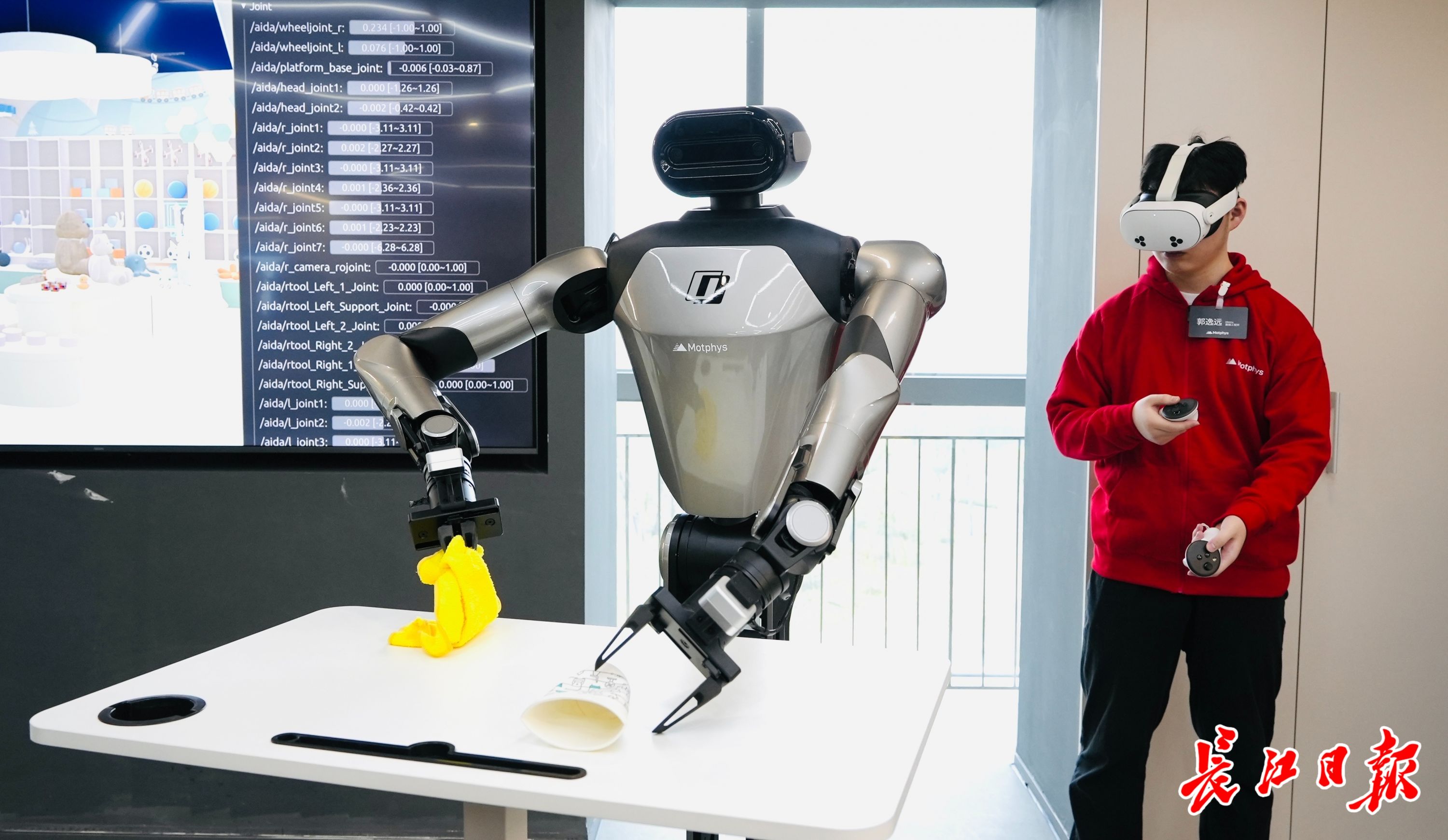 机器人训练员正头戴着VR设备,手持感应设备教机器人擦桌子。记者高文举 摄