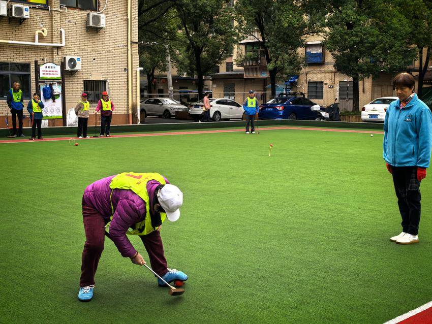 清早,阳光穿透云层洒在绿茵场上,老同志们身披金光,开始了活动前的准备工作,有练习挥杆的,有整理记分牌的,有调整拍摄角度的,一片祥和。随着一声声哨响,选手们手持球槌,气定神闲地弯腰、瞄准、挥杆,动作流畅而专注。伴随着清脆的击球声,白色门球精准过门,现场不时响起阵阵友好的喝彩声与爽朗的笑声。整个过程节奏舒缓,气氛热烈而融洽,老友们一边切磋球技,一边亲切谈笑,构成一幅生动和谐的社区生活画卷。