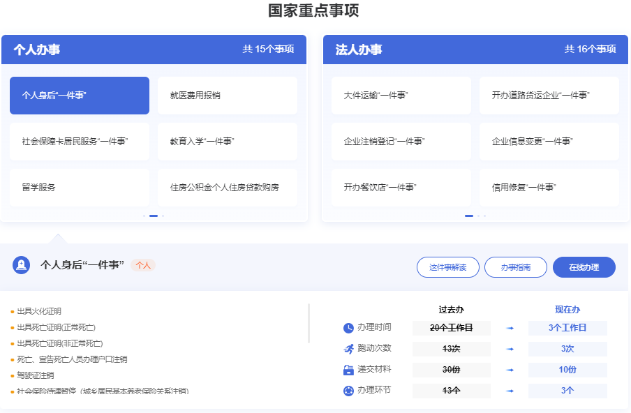 第四步:在一件事专栏找到个人身后“一件事”,点击“这件事解读”可以查看该一件事改革前后成效、办理流程、办理材料、相关政策等;如需办理,点击“在线办理”按钮,根据归属地,选择办理区域。
