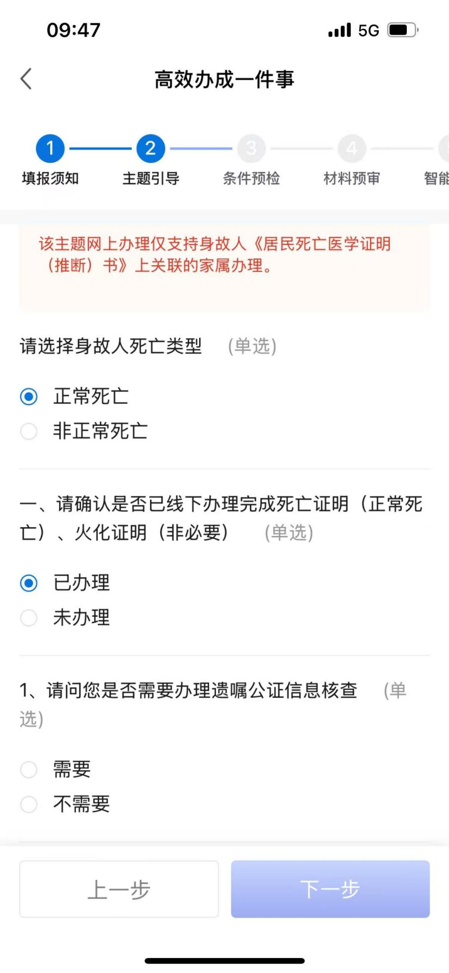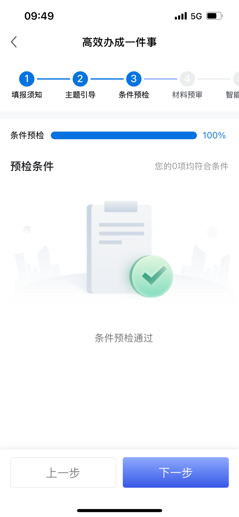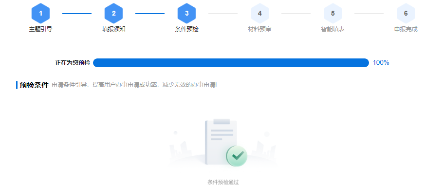第七步:完成引导选择后,点击“下一步”,就会进入到一件事的条件预检页面,校验用户是否符合该一件事办理条件。