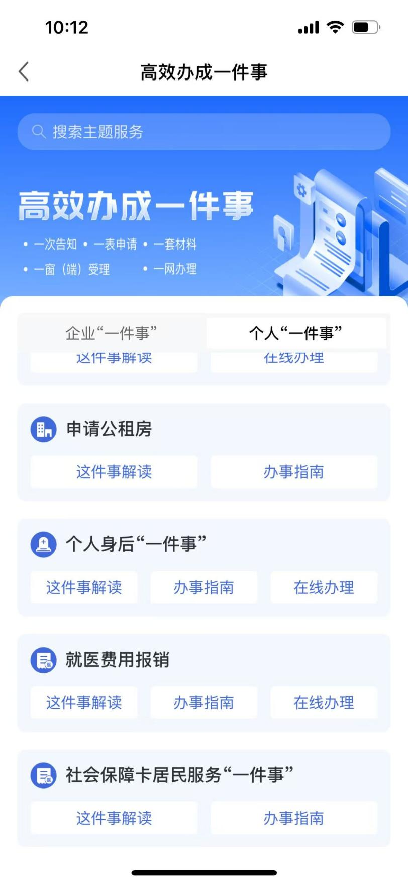 第四步:在一件事专栏找到个人身后“一件事”,点击“这件事解读”可以查看该一件事改革前后成效、办理流程、办理材料、相关政策等;