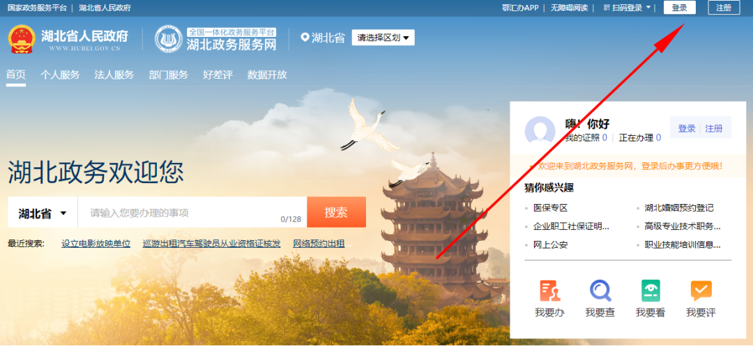 第一步:打开湖北政务服务网(http://zwfw.hubei.gov.cn),找到注册登录。