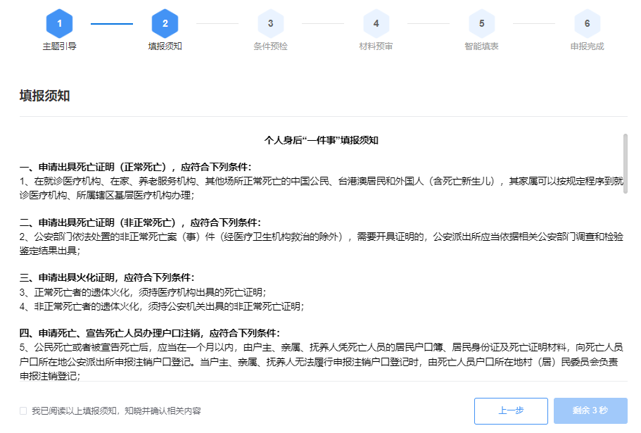 第六步:请仔细阅读“填报须知”,了解申报一件事相关条件及注意事项,勾选“我已经阅读以上填报须知”按钮,点击“下一步”按钮进入一件事条件预检页面。
