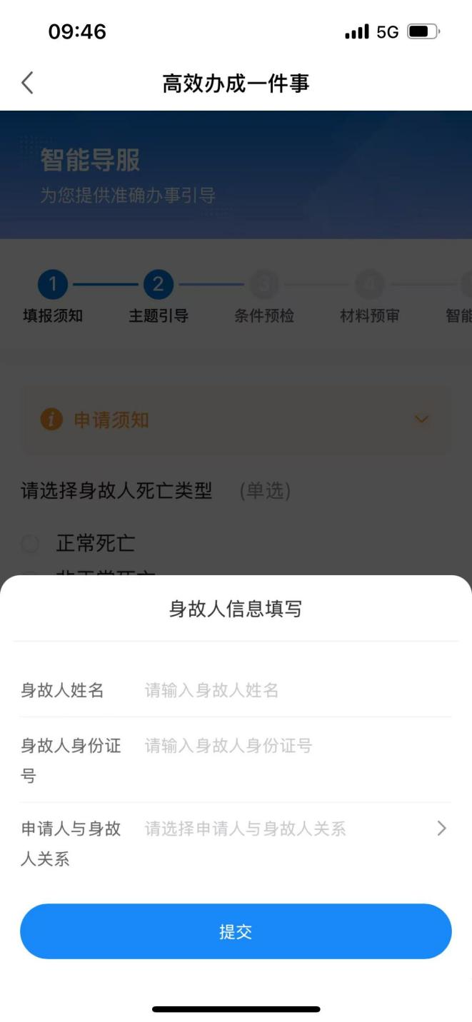 第五步:办理人员需填写身故人信息,查询到电子证照“居民死亡医学证明(推断)书”后,再根据自身实际情况,智能引导选择完成对应情形选项(注意:该主题的线上办理仅支持正常死亡类型)。