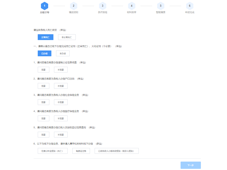 第六步:办理人员需填写身故人信息,查询到电子证照“居民死亡医学证明(推断)书”后,再根据自身实际情况,智能引导选择完成对应情形选项(注意:该主题的线上办理仅支持正常死亡类型)。