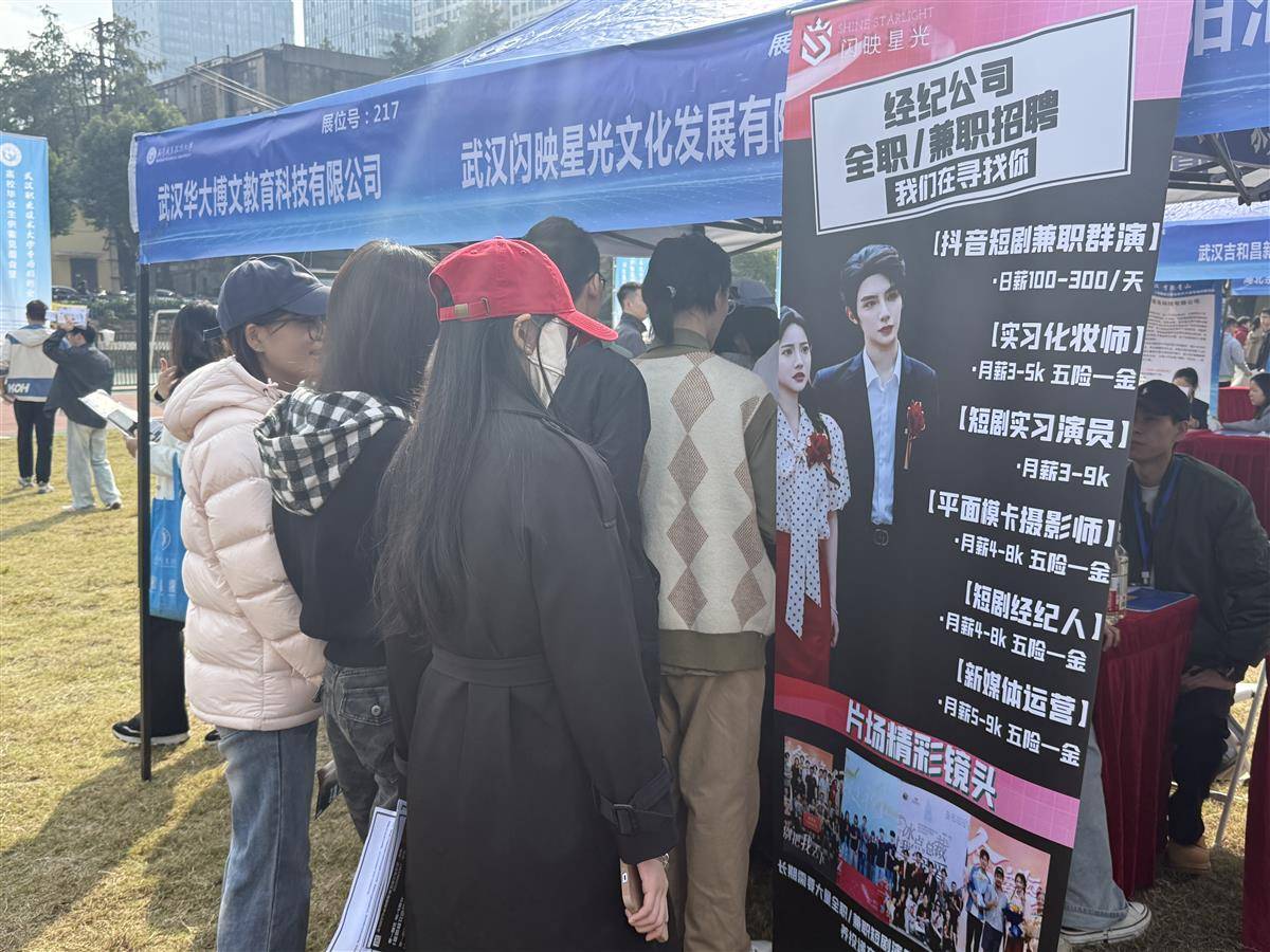 此次招聘会还迎来了一位特殊的“招聘方”,武汉职业技术大学22届大数据技术专业的岳文博同学。他与两位同为该校毕业的合伙人,共同创立了一家短剧相关的企业。岳文博向记者介绍,“在校期间我们就创办了工作室,2023年已逐步转型为实体公司。此次回母校招聘,正是希望为学弟学妹们提供机会。目前公司每月至少协拍25-30部短剧,演员招募与管理均由公司负责,能为大家提供大量实践锻炼与就业岗位。”