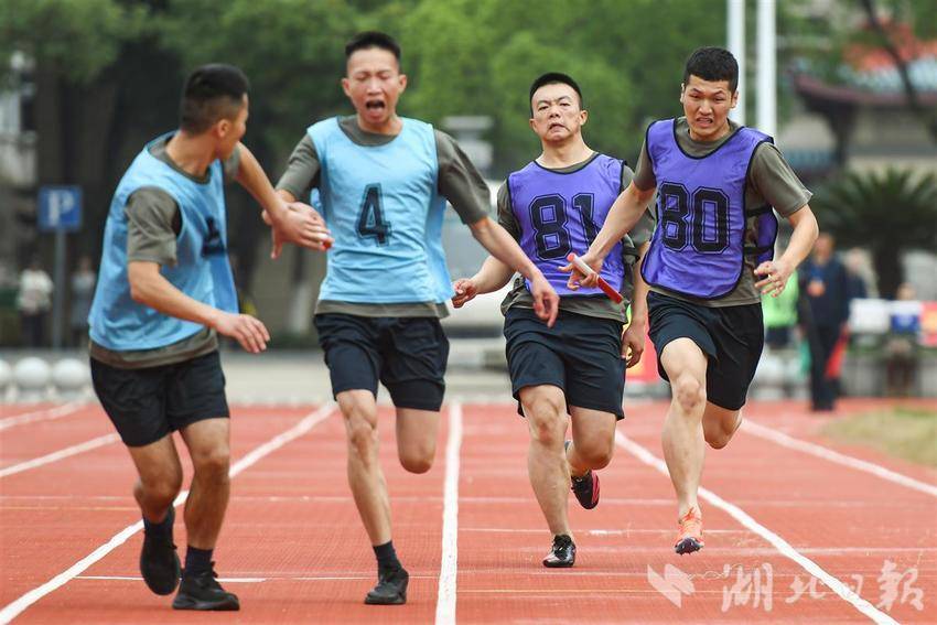 官兵在4x100米接力项目上激烈角逐。(湖北日报全媒记者 任勇 王际凯 通讯员 唐谨 粟毅 摄)
