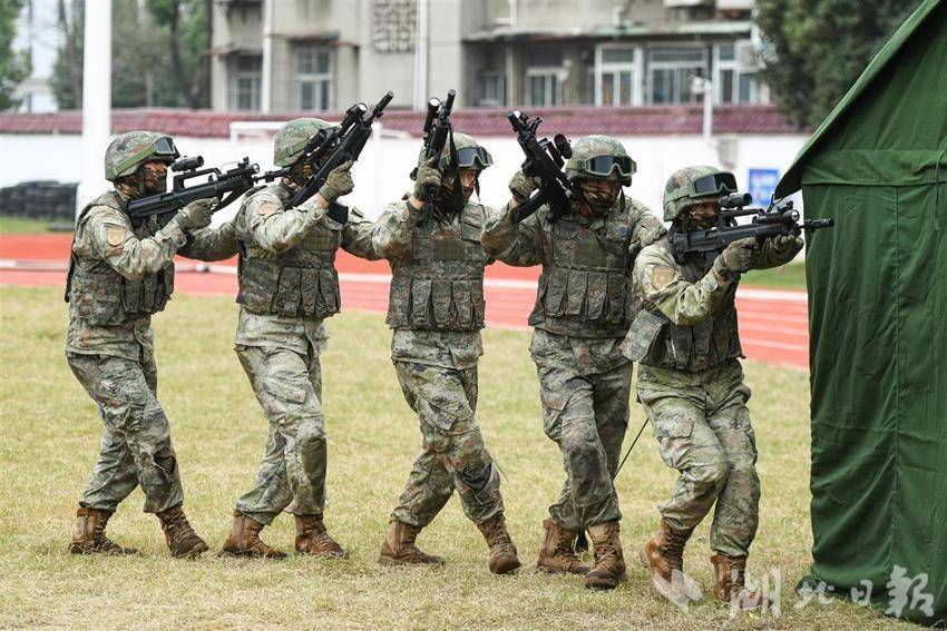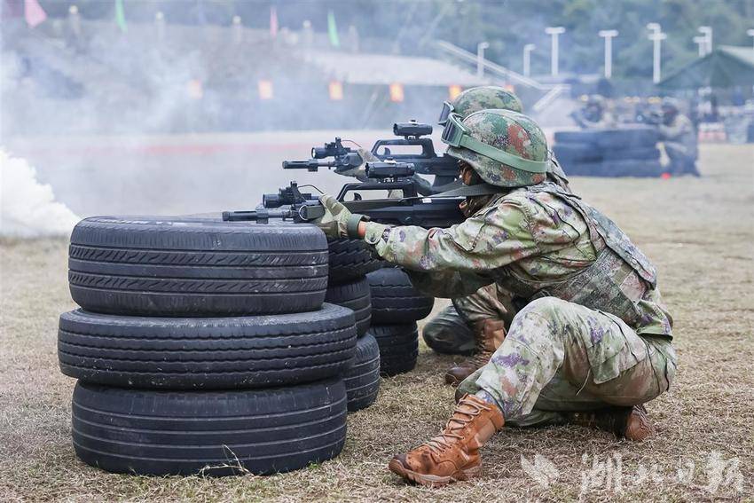 官兵在班组战术考核环节上射击。(湖北日报全媒记者 任勇 王际凯 通讯员 唐谨 粟毅 摄)
