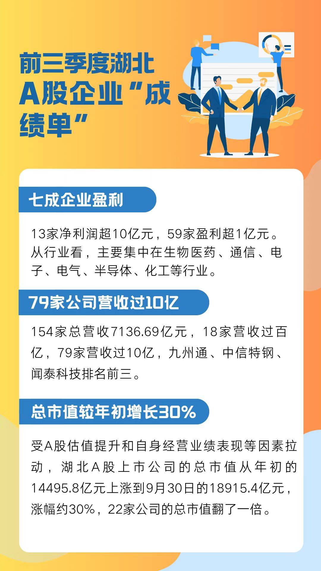 湖北日报讯(记者王艳华)截至10月31日,湖北A股上市公司三季报披露完毕。总体来看,154家公司前三季度总营收7136.69亿元,归母净利润约335亿元,7成公司实现盈利。