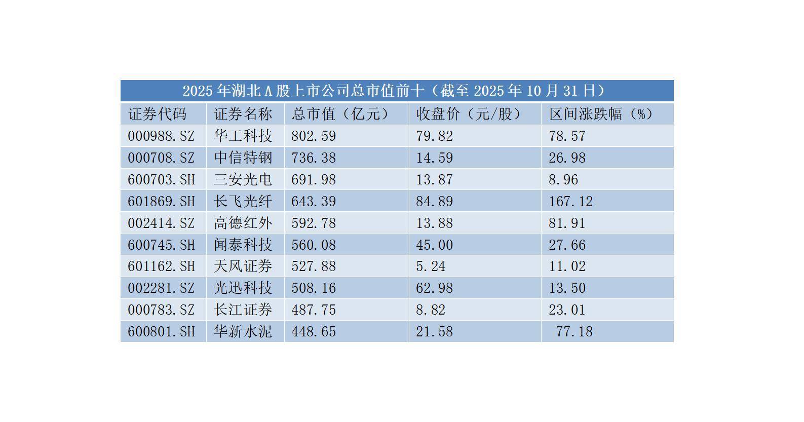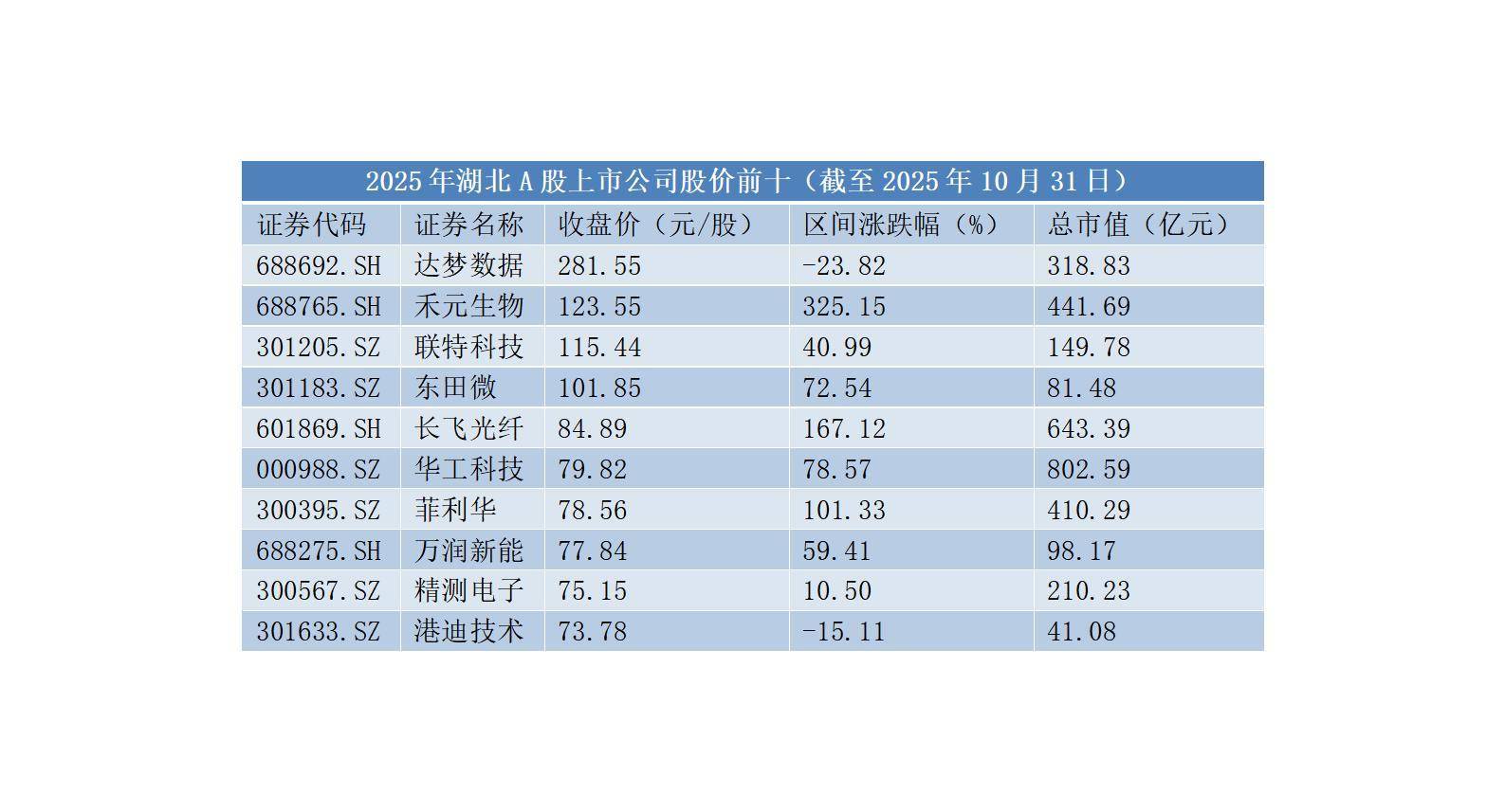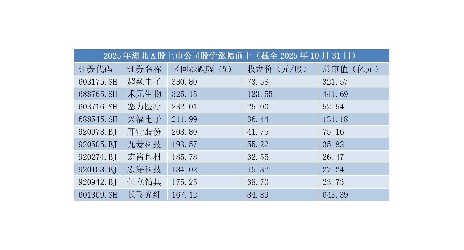 截至10月31日,湖北154家公司总体市值约1.96万亿元,股价平均涨幅39.22%。其中,115家公司股价实现增长,占比超七成。剔除新股外,股价涨幅最高的是塞力医疗,达到232.01%,股价为25元/股。