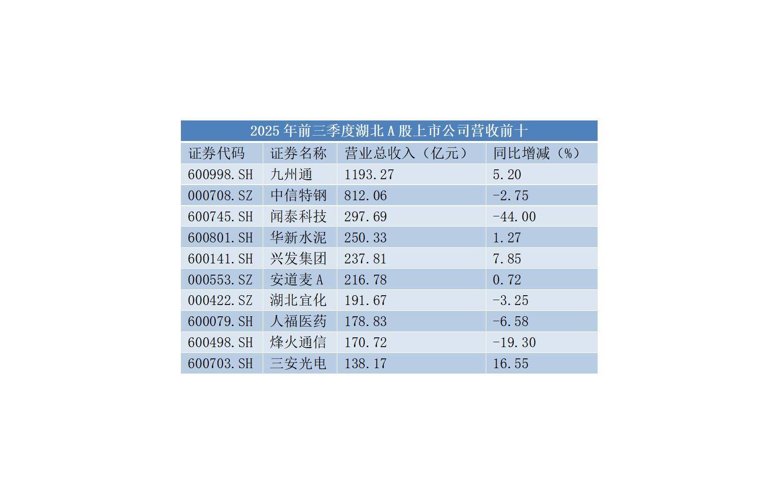 截至10月31日,154家湖北A股上市公司今年前三季度业绩全部出炉,实现总营收6972.68亿元,实现归属净利润合计339.22亿元。九州通以1193.27亿元的营收继续位居规模第一,同比增长5.2%;中信特钢以43.3亿元的归属净利润,再次拿下最赚钱小能手称号,同比增长12.88%。