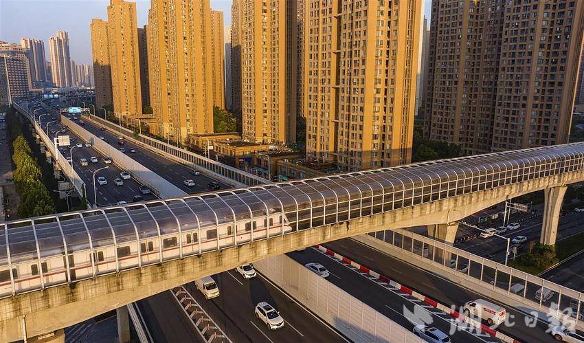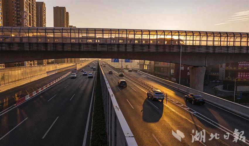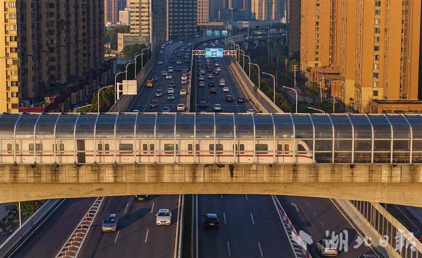 10月31日清晨,一列列地铁列车从杨泗港快速通道高架桥上呼啸而过,与桥上行驶的汽车绘就出一幅别样的城市立体交通图。此处,杨泗港快速通道青菱段高架桥下穿轨道交通五号线,公路高架和地铁高架均加装了隔音屏,能有效降低汽车和列车发出的噪声,满足两侧居民正常生活的要求。(湖北日报全媒记者 朱熙勇 摄)