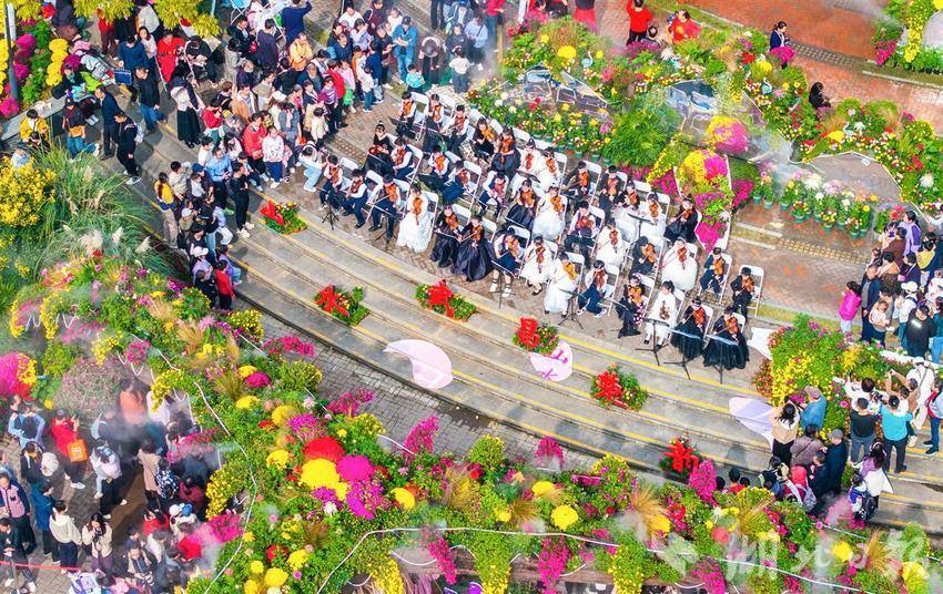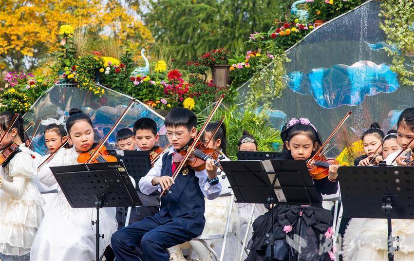 11月1日,武汉金秋菊展沙湖公园展区花团锦簇,小朋友们进行交响乐表演。