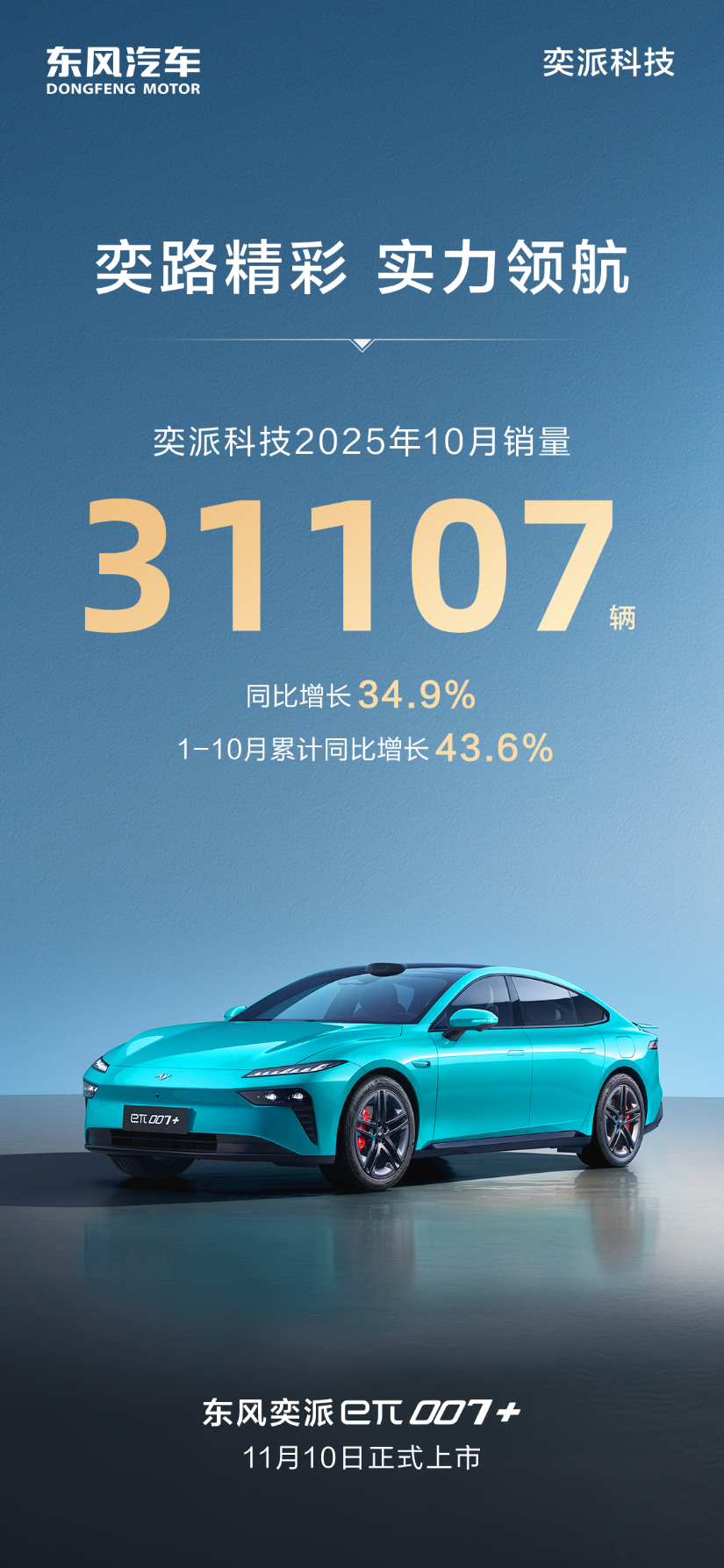 湖北日报讯(记者左晨、通讯员张逸)11月1日,东风奕派汽车科技公司(以下简称“奕派科技”)对外公布销售数据:10月销量31107辆,同比增长34.9%,月销连续突破三万,再创历史新高;前10个月累计销量同比增长43.6%。
