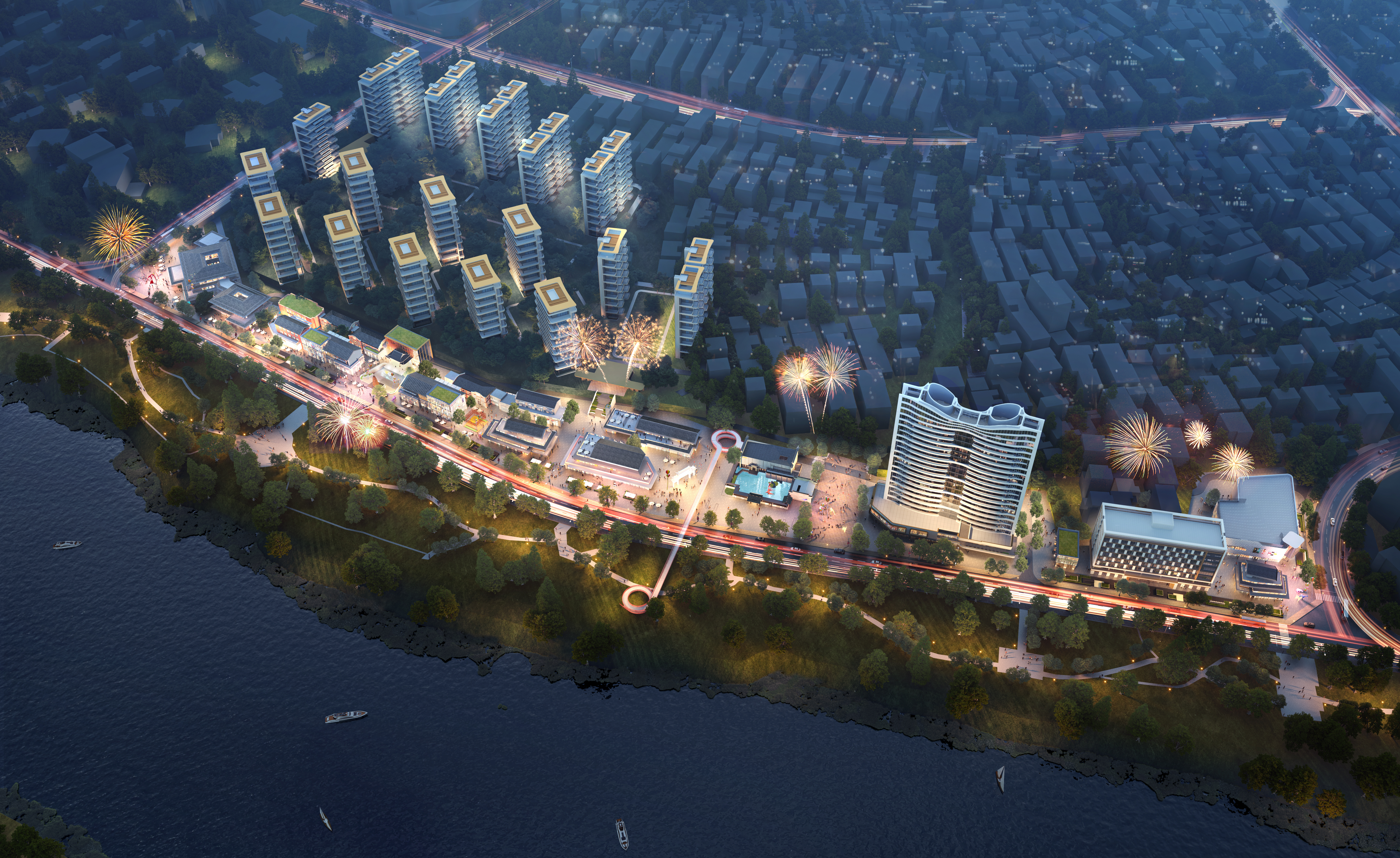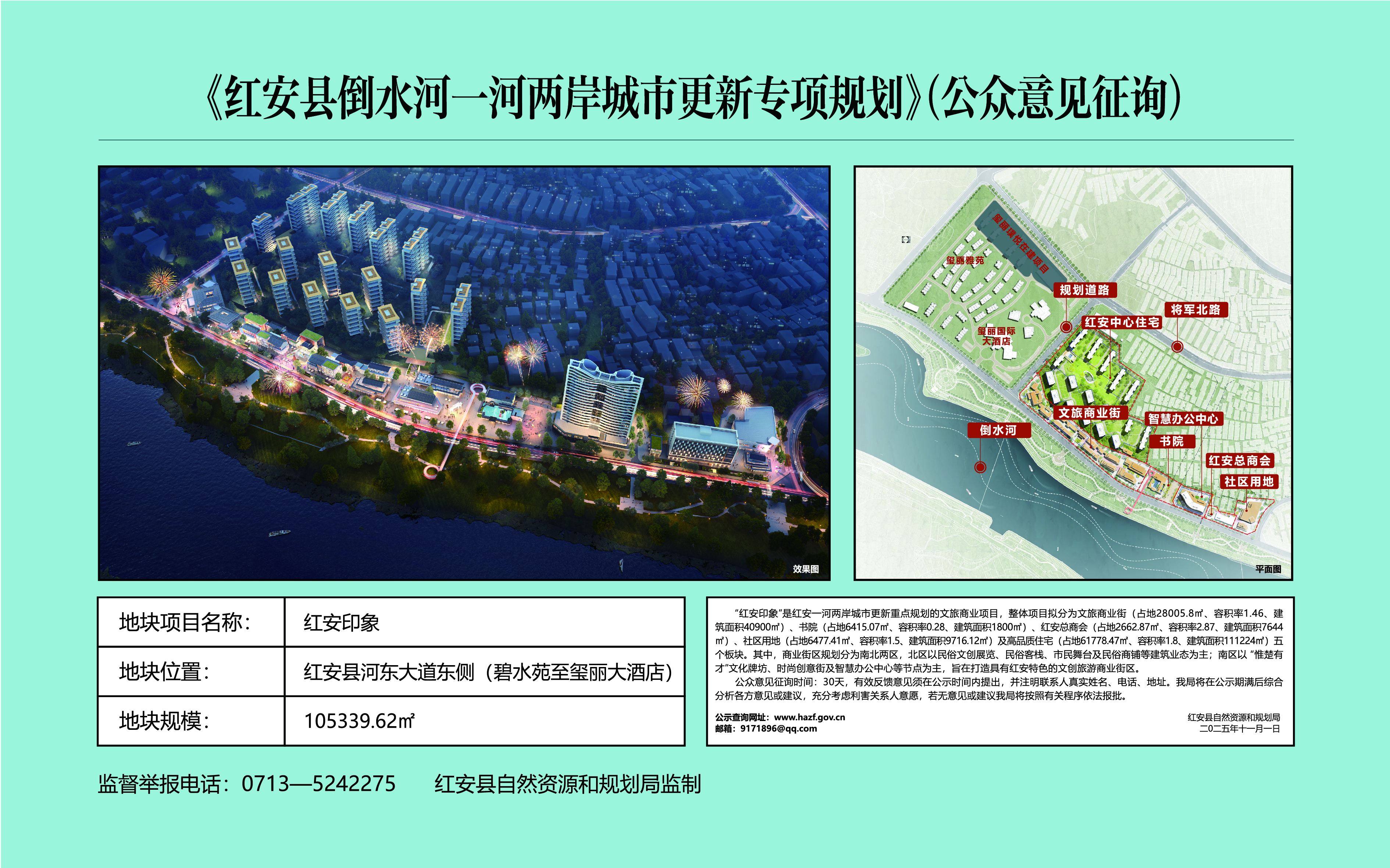 “红安印象”是红安一河两岸城市更新重点规划的文旅商业项目,整体项目拟分为文旅商业街(占地28005.8㎡、容积率1.46、建筑面积40900㎡)、书院(占地6415.07㎡、容积率0.28、建筑面积1800㎡)、红安总商会(占地2662.87㎡、容积率2.87、建筑面积7644㎡)、社区用地(占地6477.41㎡、容积率1.5、建筑面积9716.12㎡)及高品质住宅(占地61778.47㎡、容积率1.8、建筑面积111224㎡)五个板块。其中,商业街区规划分为南北两区,北区以民俗文创展览、民俗客栈、市民舞台及民俗商铺等建筑业态为主;南区以 “惟楚有才”文化牌坊、时尚创意街及智慧办公中心等节点为主,旨在打造具有红安特色的文创旅游商业街区。