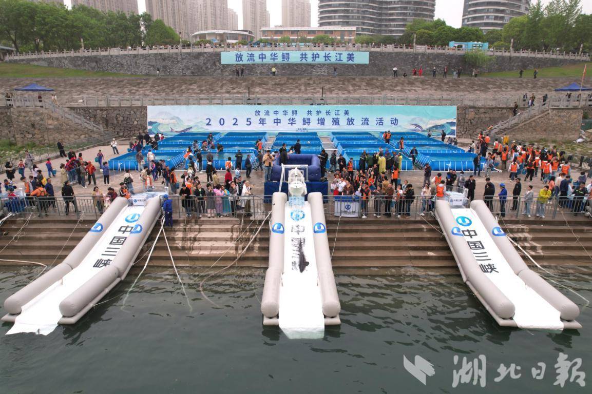 今年4月在湖北宜昌举行的中华鲟增殖放流活动现场。(湖北日报通讯员陈臣摄)