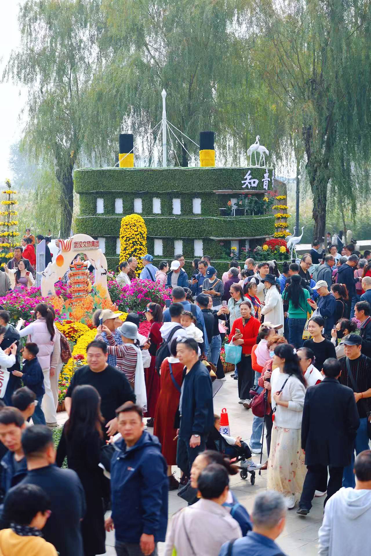 菊展不仅是视觉盛宴,更成为文旅融合的生动现场。开幕当天,黄鹤楼互动项目《梦回太白》的演员现身菊雕黄鹤楼前,与市民趣味对诗;《知音号》同款演艺与《凤舞九天》舞蹈也以快闪形式亮相,在菊香中演绎长江文化与知音故事,引来观众阵阵惊叹。一旁的文创摊位上,以三大地标为灵感的百款文创产品备受青睐,让游客得以把“可带走的武汉记忆”带回家。