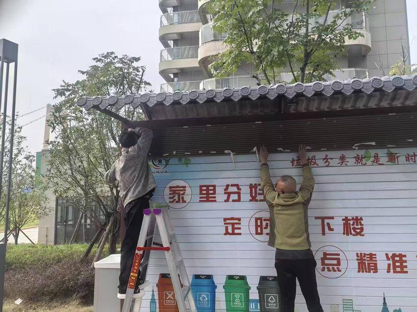 随着“家里分好类、定时下楼投”逐渐成为小区居民的习惯,垃圾投放点的设施完好与标识清晰显得尤为重要。针对部分垃圾棚因长期使用出现棚顶松动、支架锈蚀等安全隐患,临江郡小区服务中心高度重视,迅速组织施工人员对棚顶进行加固,重新喷涂了防锈涂层,并更新四类垃圾标识,确保分类指引清晰明了,方便居民精准投放。