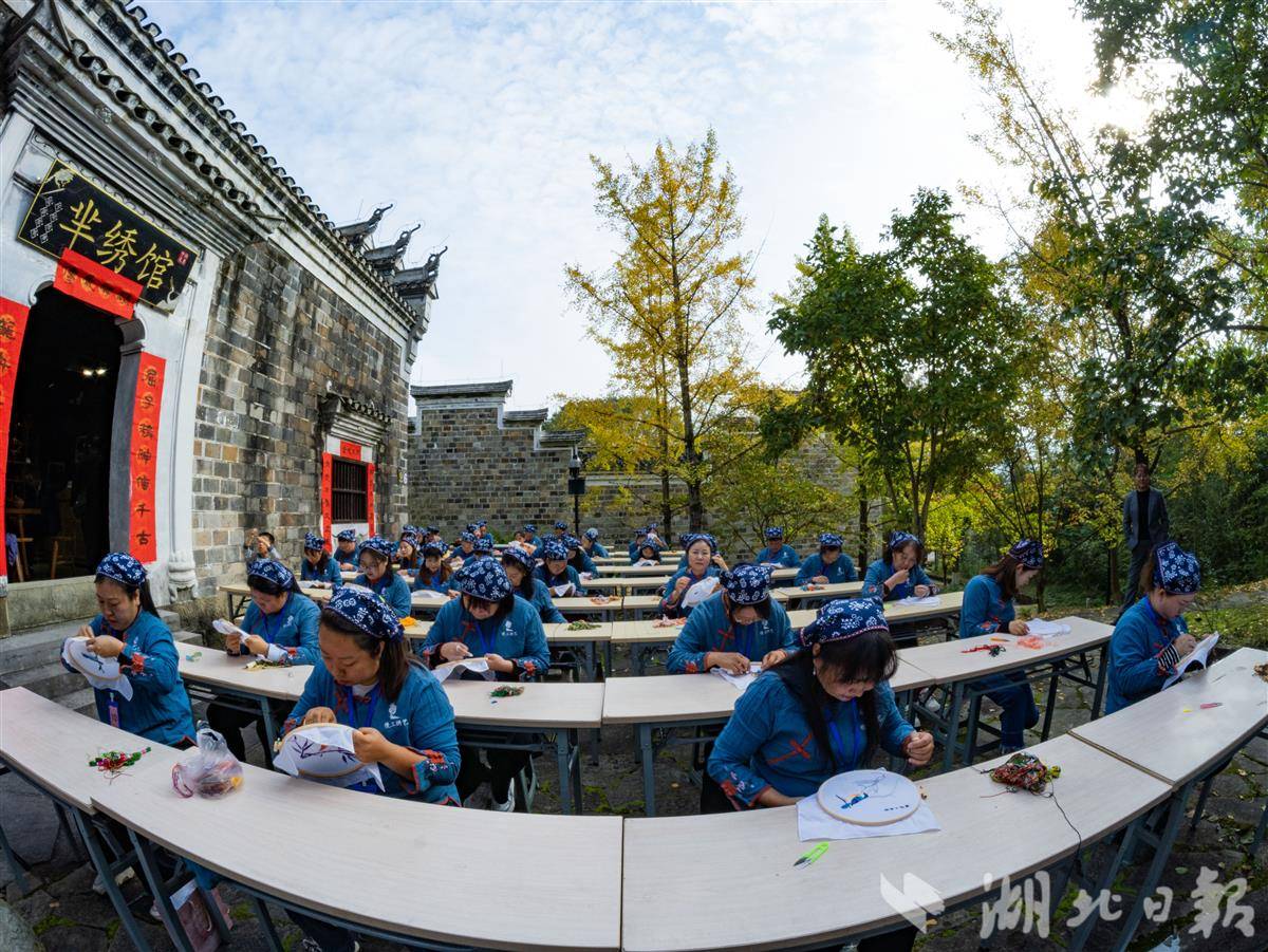 11月2日,在秭归县屈原故里文化旅游区芈绣馆内,绣娘们正在进行“三闾刺绣”技艺比赛。