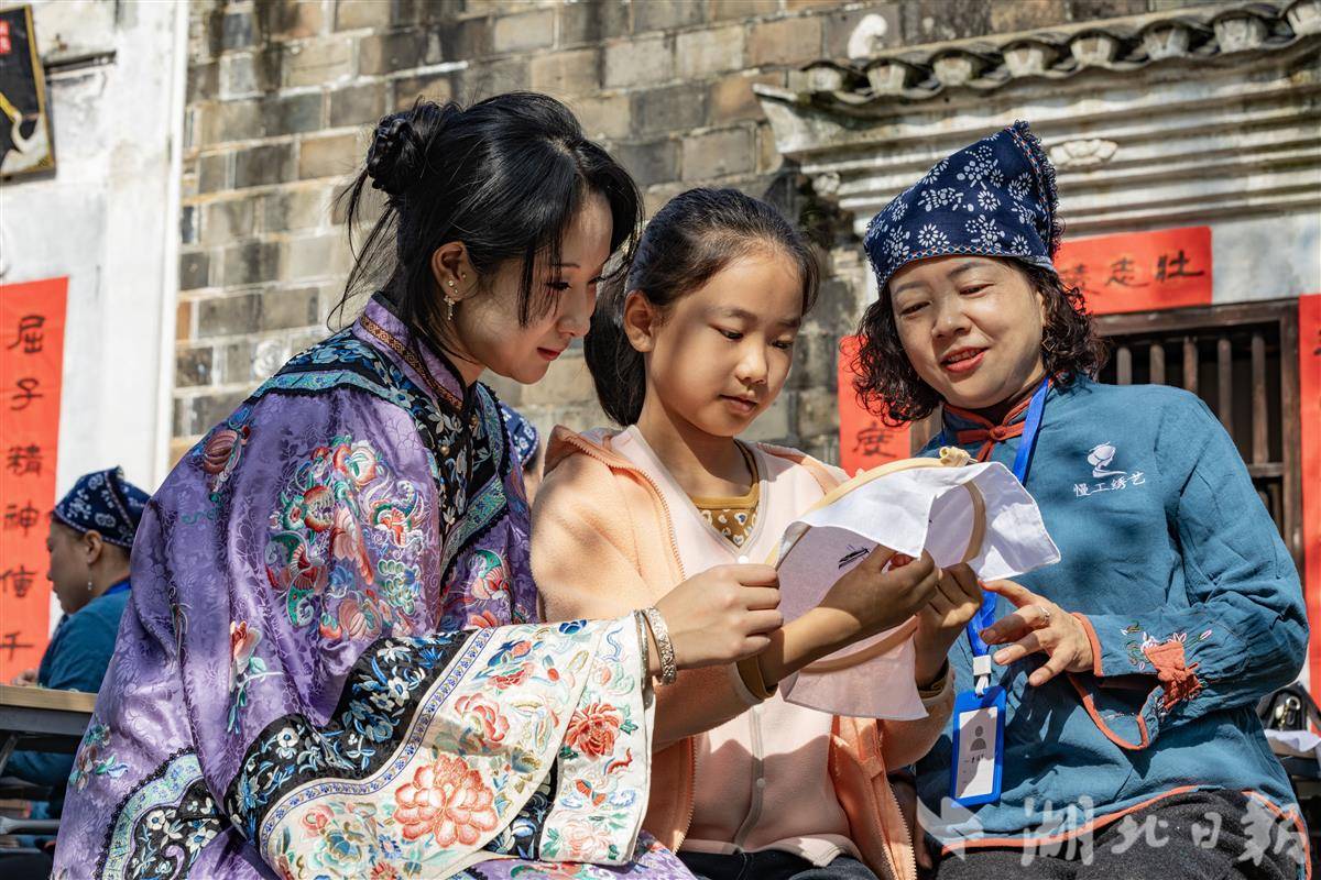 11月2日,在秭归县屈原故里文化旅游区芈绣馆内,小朋友正在向绣娘们学习刺绣技巧。