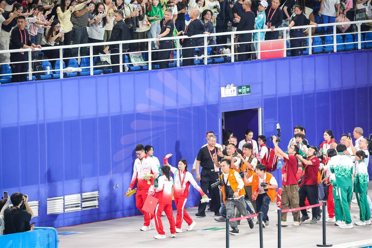 11月2日,广东奥体中心游泳馆,第十五届全运会跳水项目诞生首金,复出的奥运冠军全红婵帮助广东女团实现卫冕。(湖北日报全媒记者 时龚 摄)
