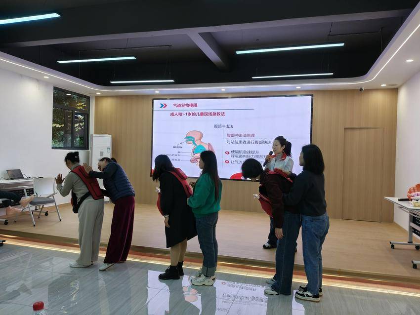 活动现场,区红十字会救护师资覃彩兰老师化身“健康导师”,用通俗易懂的语言拆解心肺复苏操作要领,结合模拟人演示自动体外除颤器(AED)使用步骤,还通过情景模拟还原气道异物梗阻急救场景,手把手指导参与者实操练习,让“救命技能”从书本走进生活。随后,五医院医生围绕儿童生长发育热点问题展开科普,解答家长们的育儿困惑。