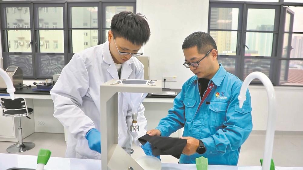 近日,在际华三五四二纺织印染研究院内,工作人员正对新研发的高性能面料进行功能测试。