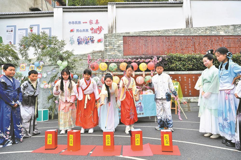10月31日,在保康县城关镇小学诗韵雅集游园会“诗礼投壶轩”摊位上,学生们正在体验投壶。当天,该校举办了一场别开生面的诗韵雅集游园会,通过“游园闯关+艺术创作+汇演实践”的方式,让学生们在趣味互动中感受传统文化的魅力。(来源:襄阳日报 余夕雯 李兆忠 摄)