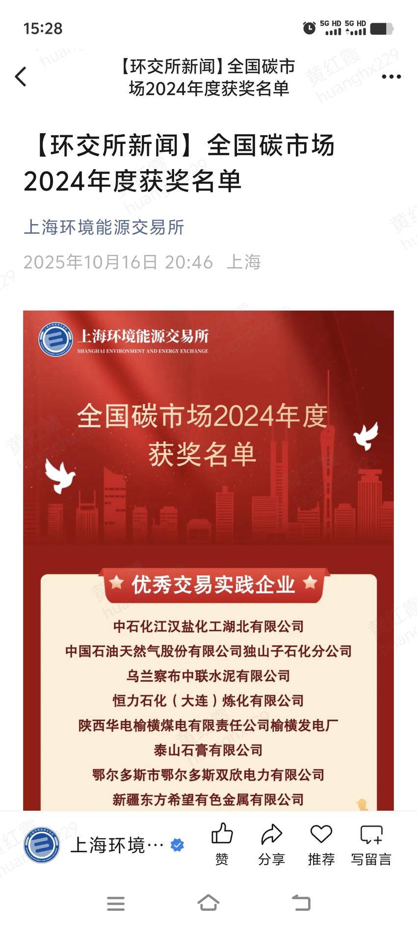 湖北日报客户端讯(通讯员 黄红霞)10月16日,上海环境能源交易所公布了全国碳市场2024年度获奖名单,中石化江汉盐化工湖北有限公司以首位获评“优秀交易实践企业”。