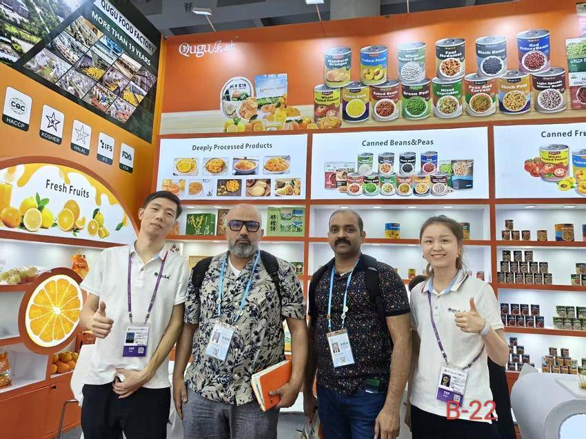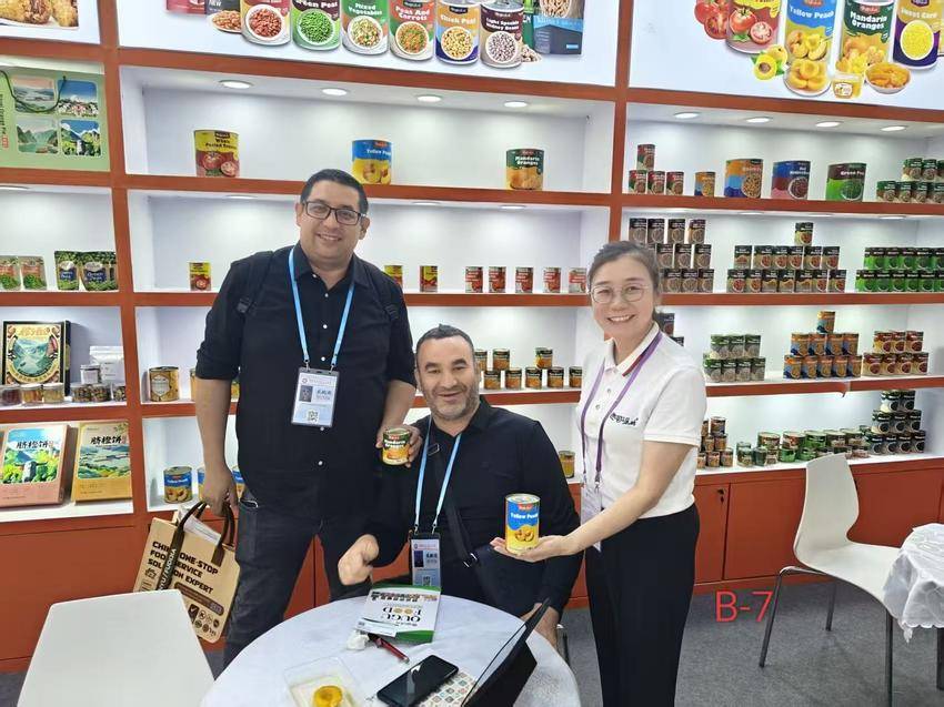 走进屈姑食品的展位,一股清新的柑橘芬芳扑面而来。今年不仅有柑橘罐头、豆类罐头、鲜果脐橙等传统产品,更有NFC脐橙鲜榨汁、橙类糕点等创新产品,琳琅满目,吸引了大量境外采购商驻足品鉴、洽谈。工作人员介绍,开展仅两天,屈姑食品已接待来自新加坡、印度尼西亚、迪拜、非洲等地区的新老客户,开展首日签单量为76万元人民币,其中鲜果脐橙销量为10个柜,罐头类产品尤为受欢迎。次日迎来单笔最大订单——也门采购商采购果蔬罐头190万美元,意向订单更是络绎不绝,预计后续成交量将持续增长。