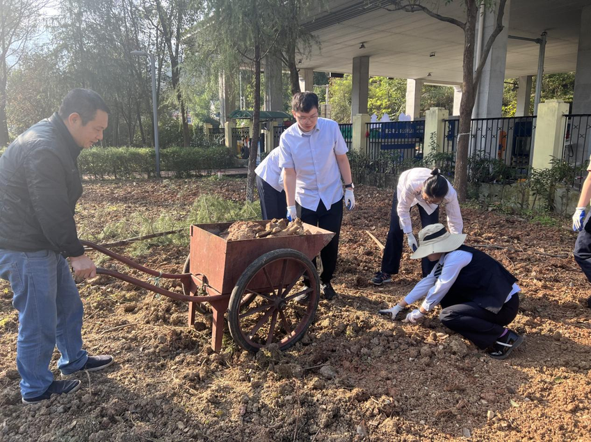 职工们分工协作、干劲十足。有的手持铁锹深翻土壤,改善土质;有的推动耙子平整土地,清理碎石杂草。“以前这片空地利用率不高,整理后既能美化环境,又能为建设盆景园打下基础。”职工们一边劳动,一边畅想庭院未来的美景。