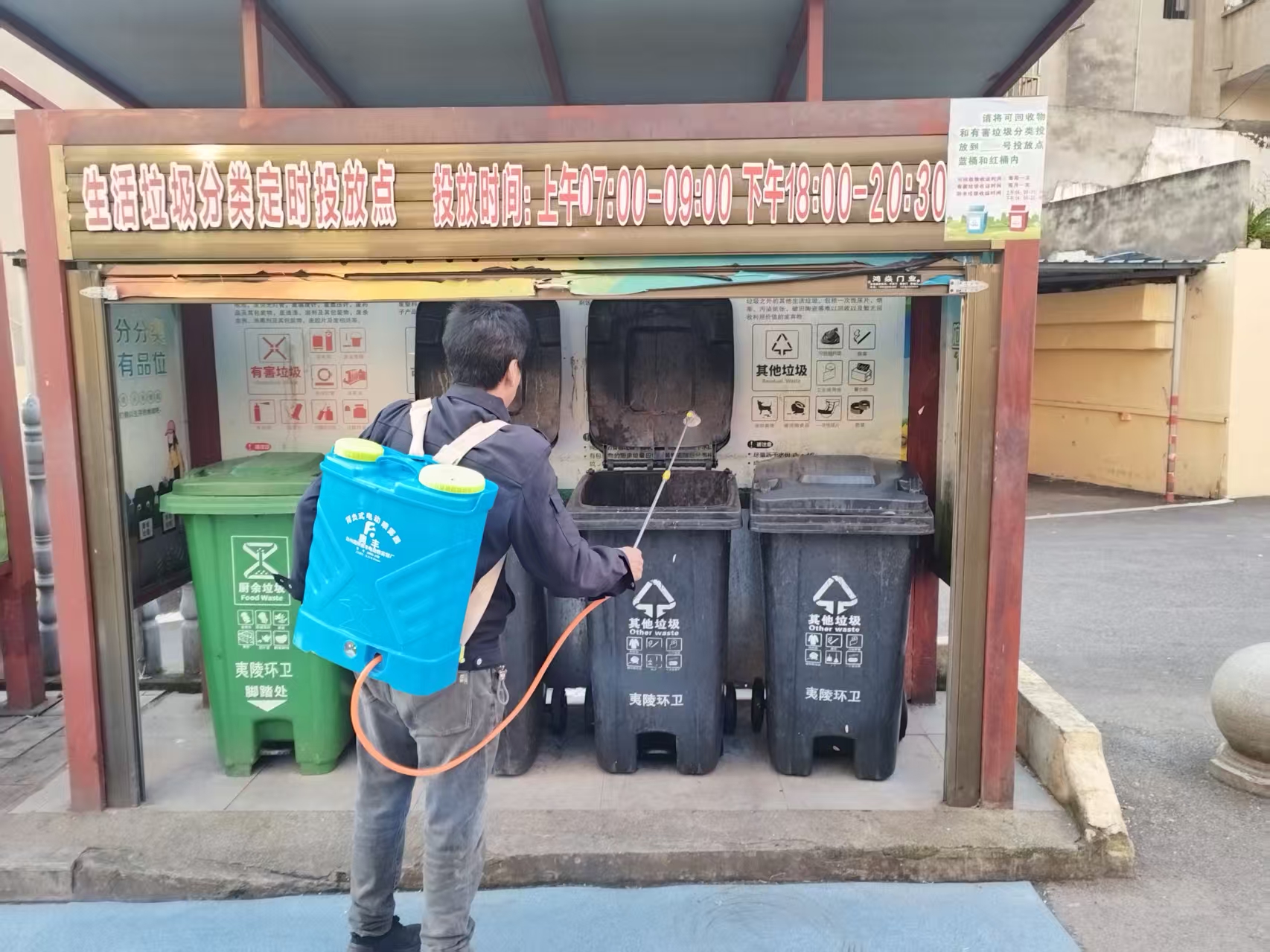 在清洗垃圾桶的同时,消杀工作也同步进行。工作人员按照科学配比调制好消毒液,对垃圾桶、垃圾中转站及周边环境进行了全面喷洒消毒。特别是针对垃圾桶的把手、盖子等容易接触的部位,进行了重点消杀,有效遏制细菌滋生,防止疾病传播。