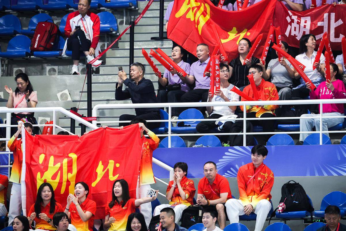 11月3日,广东奥体中心游泳馆,第十五届全运会跳水项目展开男子团体决赛的争夺。在双人3米板比赛中,湖北组合王宗源/郑九源以266.88分力压广东组合谢思埸/黄博文位列第一。看台上,王宗源父母与湖北助威团一起为湖北健儿加油。(湖北日报全媒记者 时龚 摄)