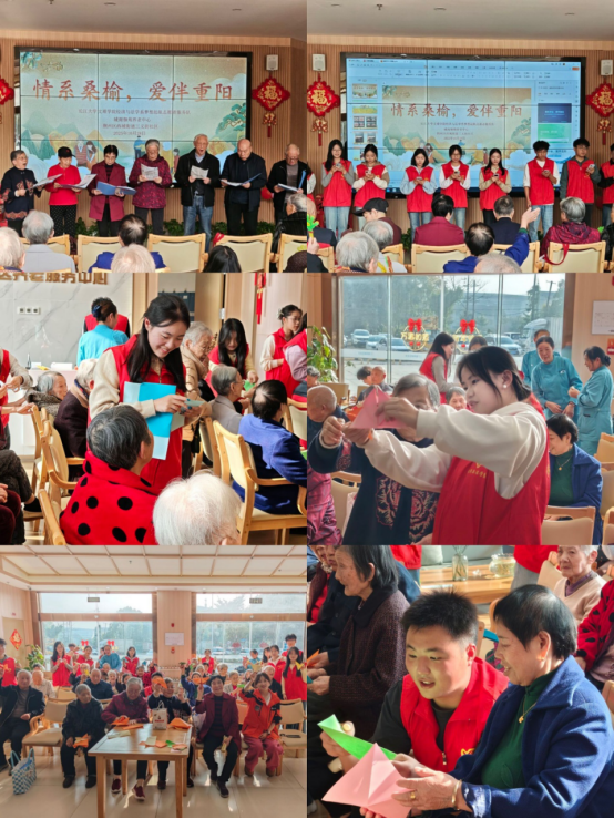 10月28日下午,第二场“情系桑榆,爱伴重阳”活动在城南御苑社区养老服务中心举行。活动由经济与法学系梦想起航志愿者服务队主办,队员们提前做好分工协作,统一服装、有序进场。活动伊始,全体志愿者与老人们合唱重阳歌曲,并带来钢琴独奏《彩云追月》、诗朗诵等形式多样的文艺节目,在深情与温暖中弘扬传统文化。演出结束后,志愿者与老人们围坐交流,陪伴他们剪纸、折纸、绘画,鼓励他们亲手创作节日作品,在互动中增进感情,在陪伴中传递尊重。活动最后,大家合影留念,并在志愿者协助下完成场地整理,用真诚与责任画上圆满句号。