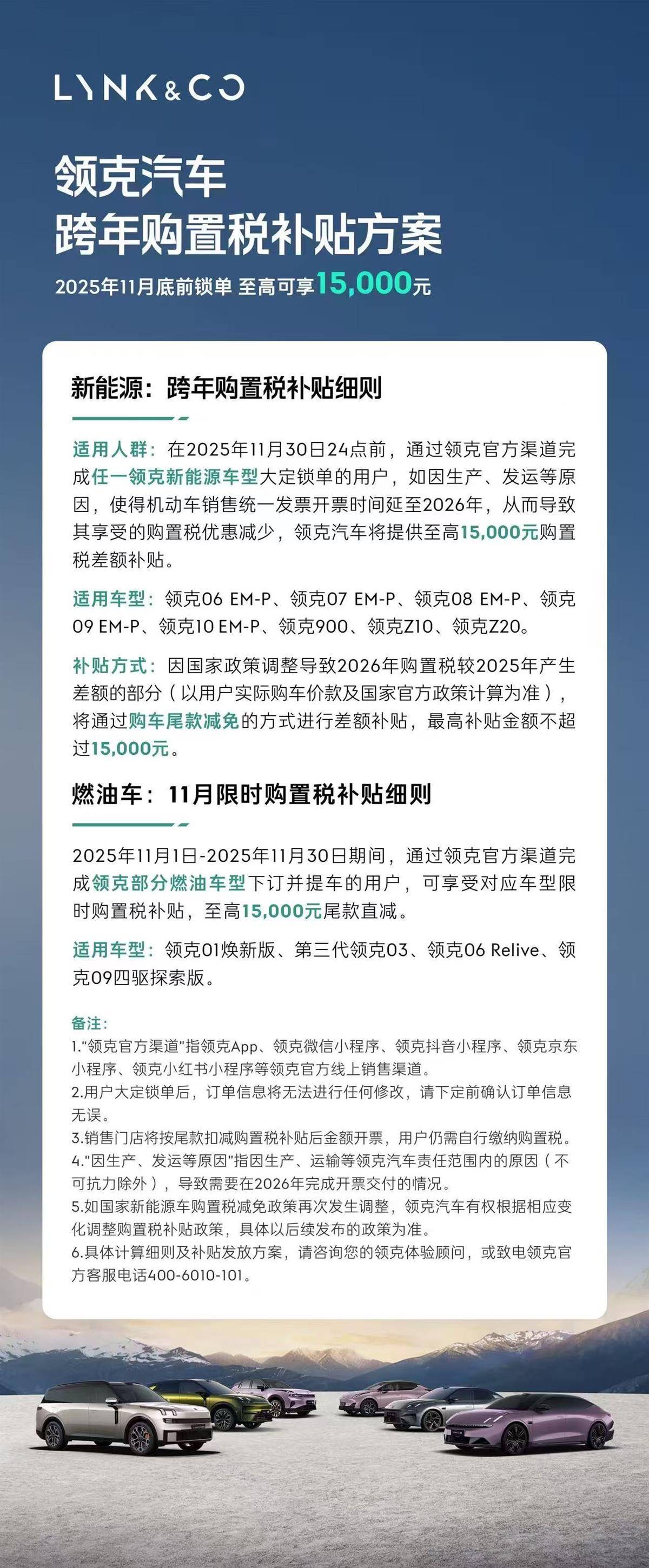 为感谢用户的信任与支持,消除用户担心因跨年开票及交付可能导致的购置税优惠减少的顾虑,领克针对新能源车型特别推出“跨年购置税补贴方案”政策。凡在2025年11月30日24点前,通过领克官方渠道完成任一领克新能源车型大定锁单,如生产、发运等原因,使得机动车销售统一发票开票时间延至2026年,从而导致其享受的购置税优惠减少,领克汽车将为用户提供购置税差额补贴,补贴标准以用户实际购车价款及国家官方政策计算为准,单辆车最高补贴金额不超过15,000元。
