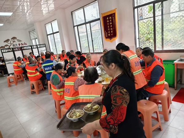 (方仁在孝感市应城市汤池镇温泉社区“幸福食堂”为环卫工人提供免费工作餐,并共度五一劳动节)
