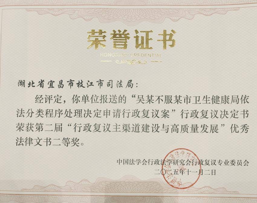 湖北日报客户端讯 近日,枝江市司法局撰写的行政复议决定书在第二届“行政复议主渠道建设与高质量发展”优秀法律文书评选中荣获全国二等奖,标志着我市行政复议工作质效获得国家级认可。
