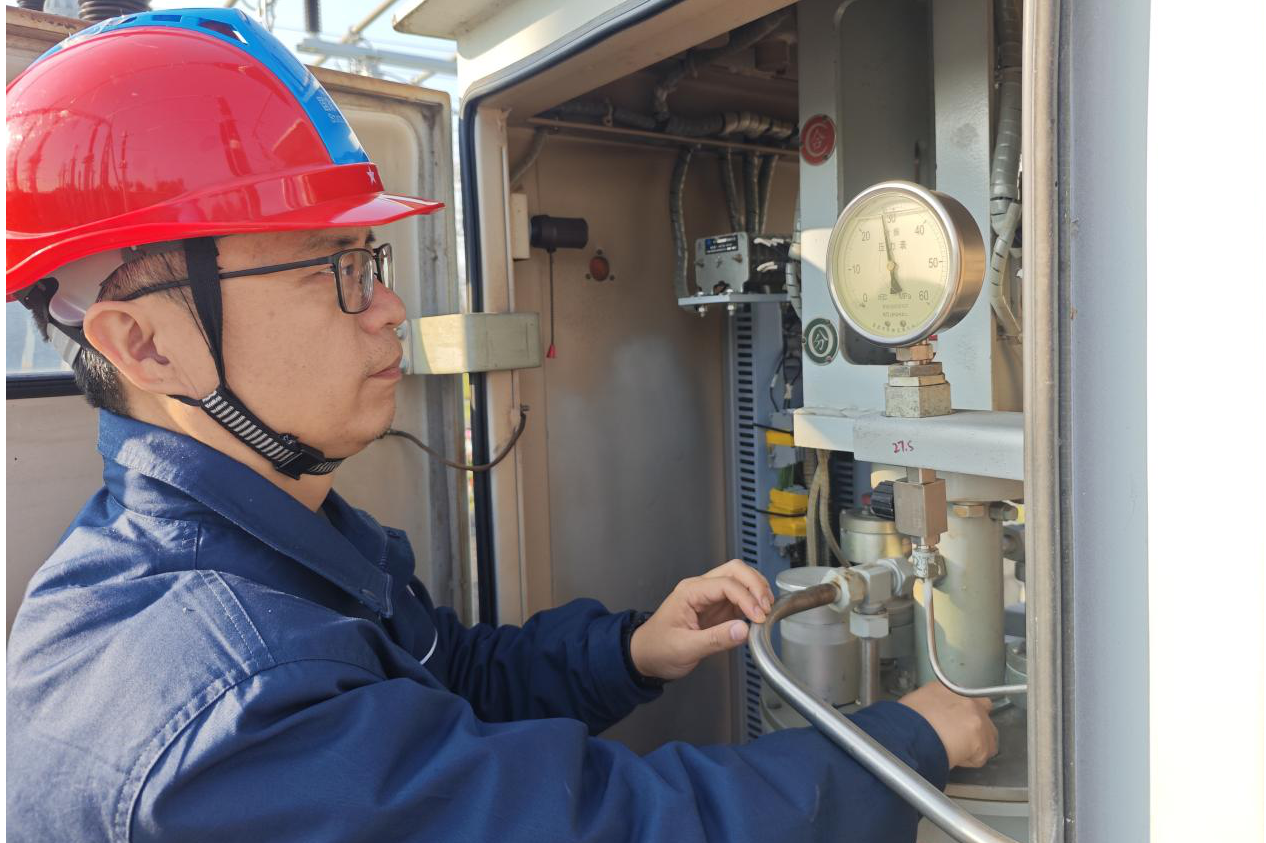 国网湖北直流公司检修人员检查±500千伏江陵换流站江周Ⅰ线断路器液压情况。