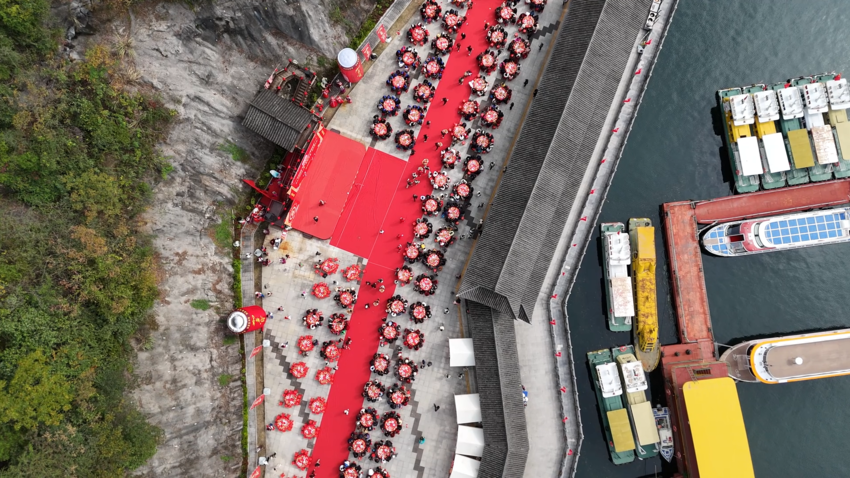 活动在欢乐的歌舞表演中拉开序幕,瞬间点燃现场气氛。“花家囍韵”巡游中,迎亲队伍排起长龙,现场锣鼓喧天、唢呐嘹亮,拦门对歌、哭嫁等环节为游客上演一场别具特色的土家族传统婚礼,引得游客纷纷拿出手机拍照记录。