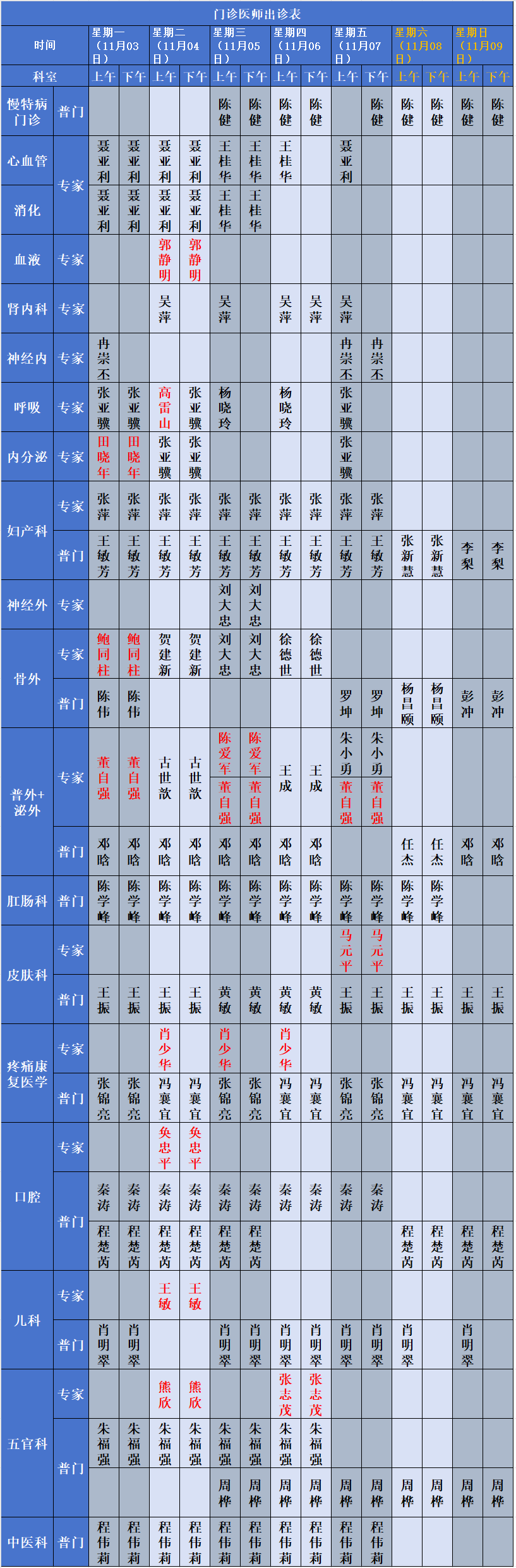 2025年11月03日-11月09日门诊坐诊公示