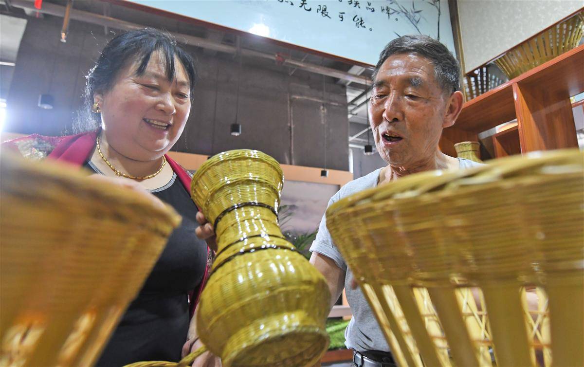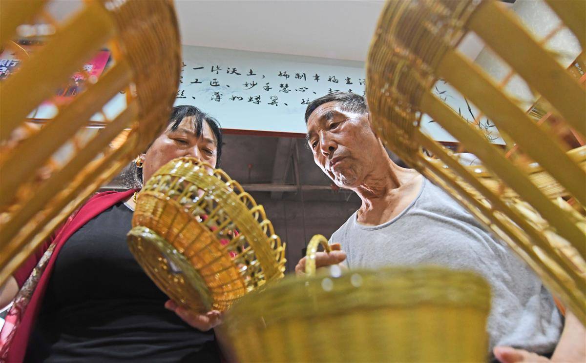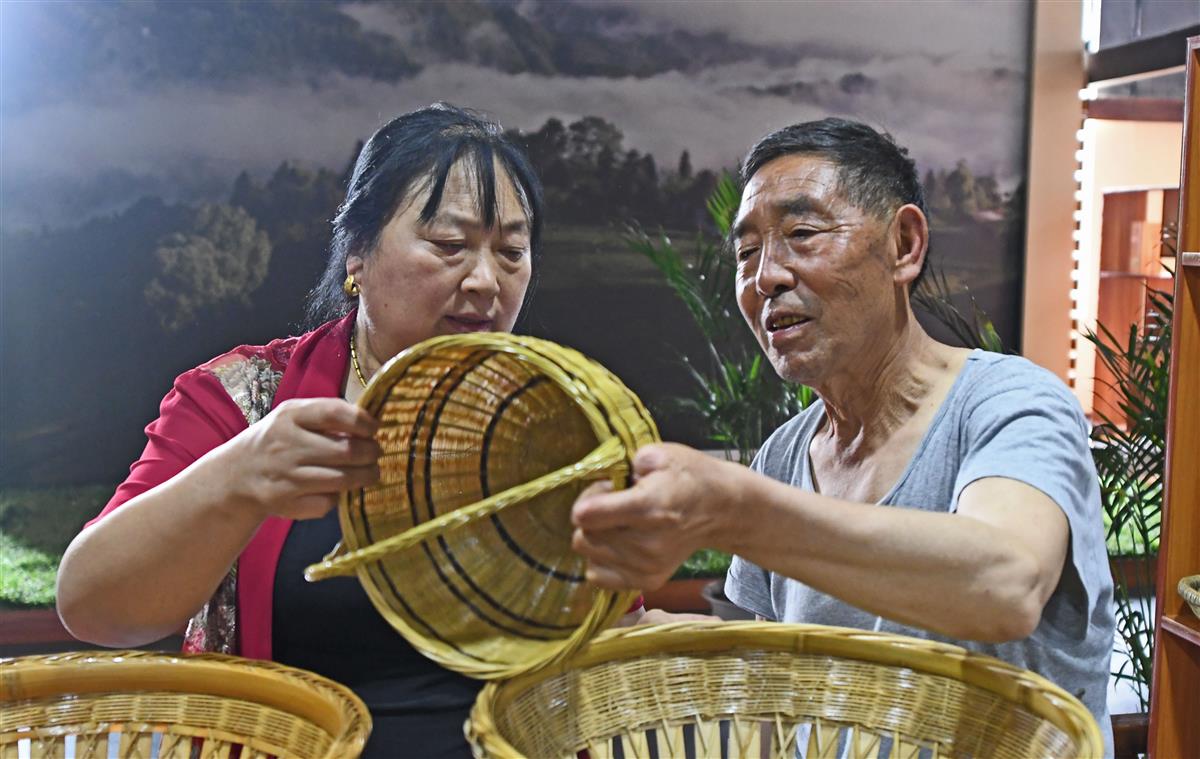 罗官章与大女儿李凤英在一起研究土家竹编产品。