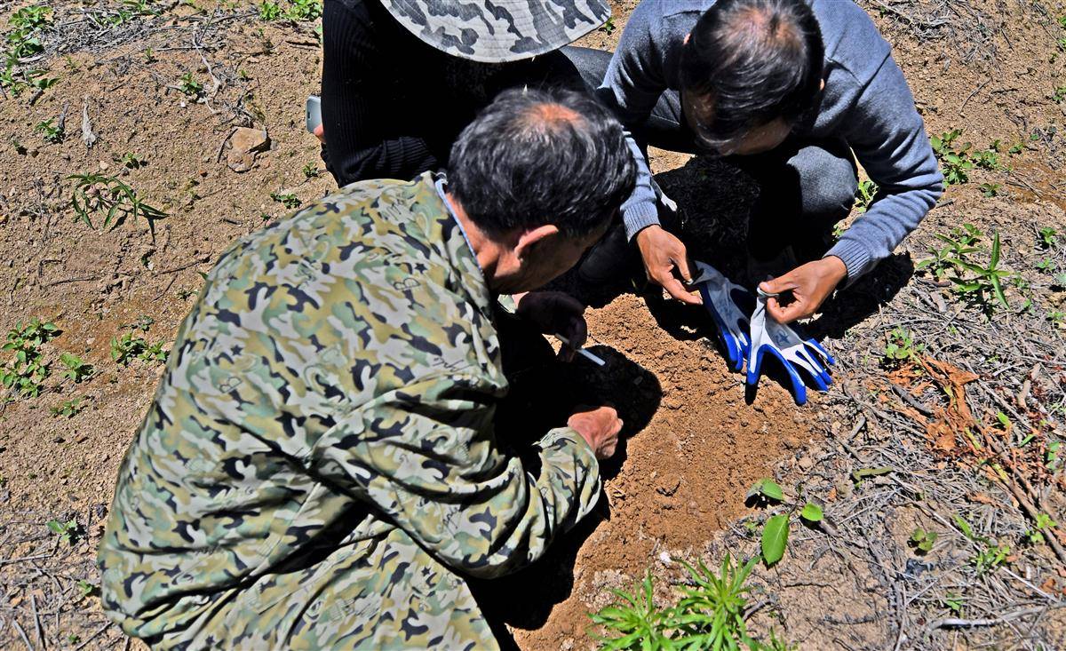 在天麻田,与技术员一道工作。