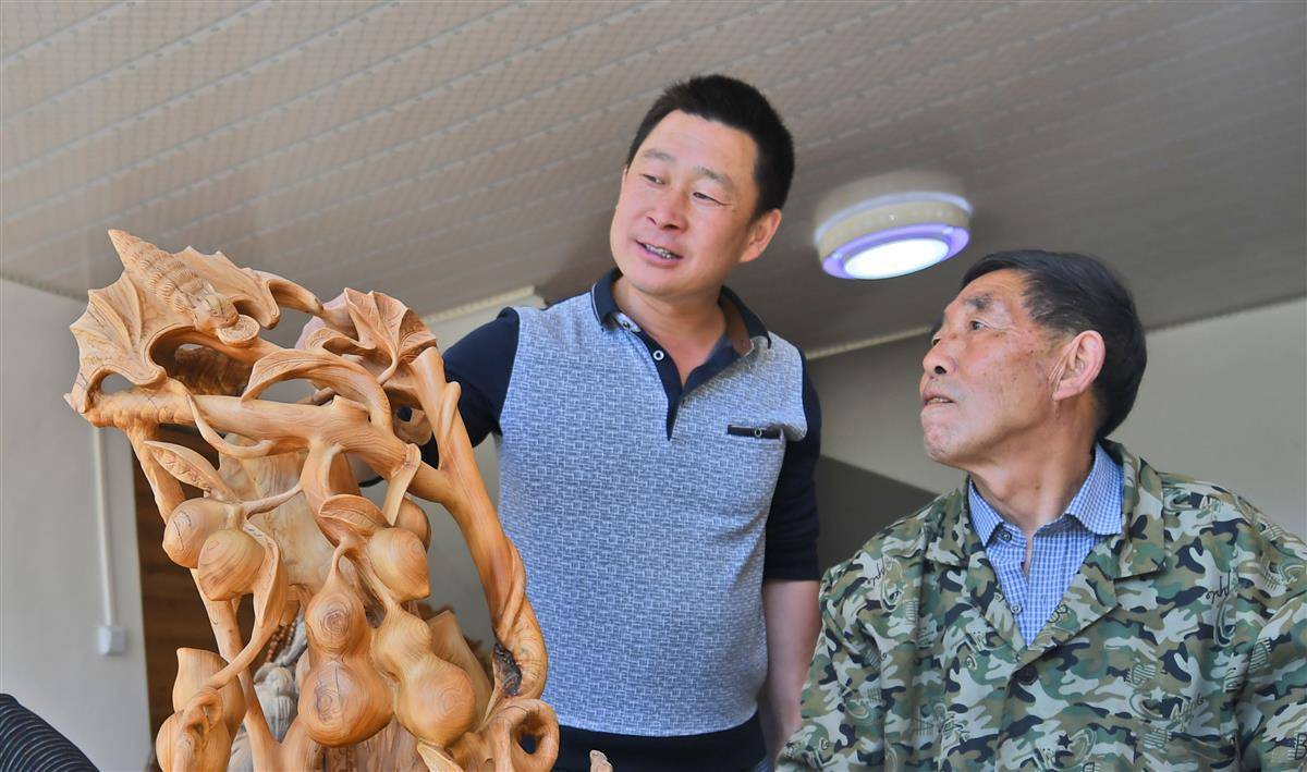 罗官章与乡亲们琢磨大山根雕的开发。