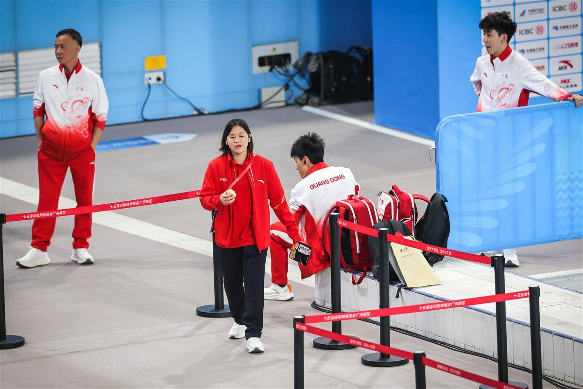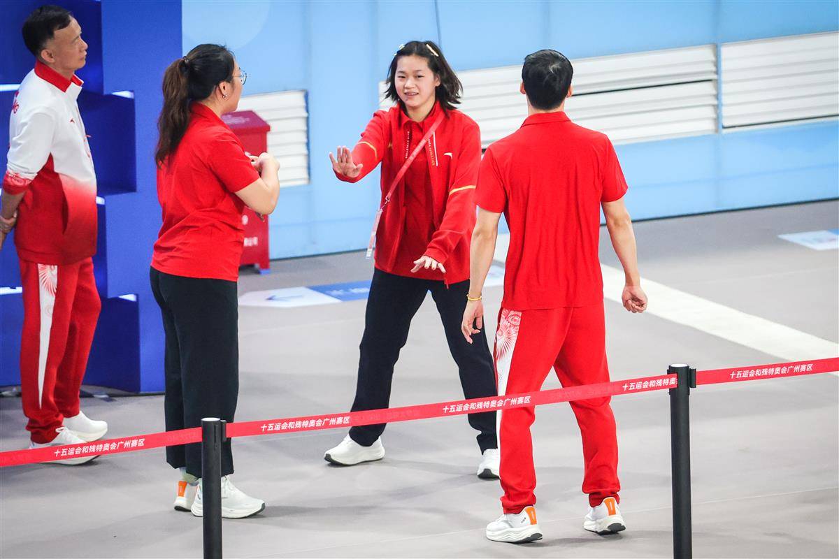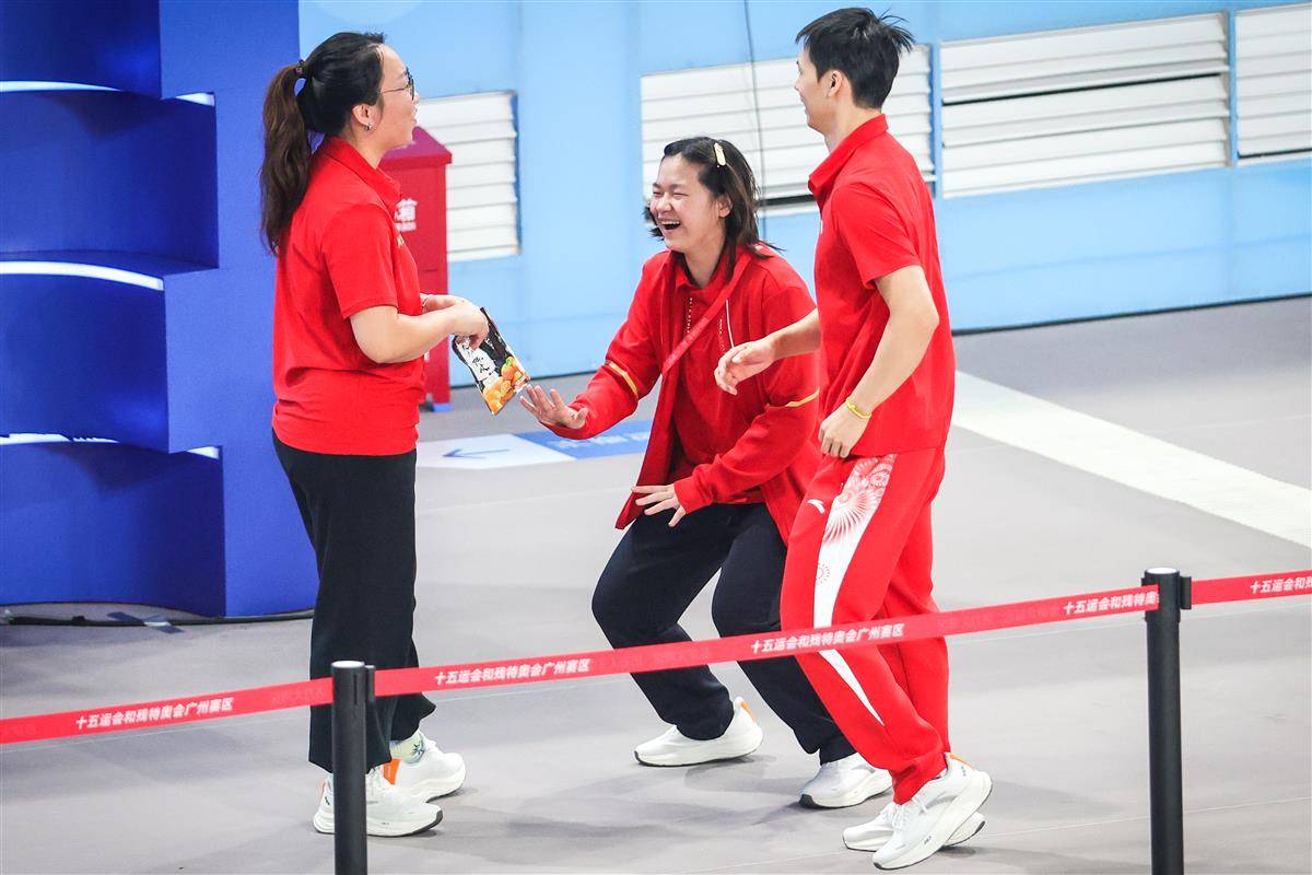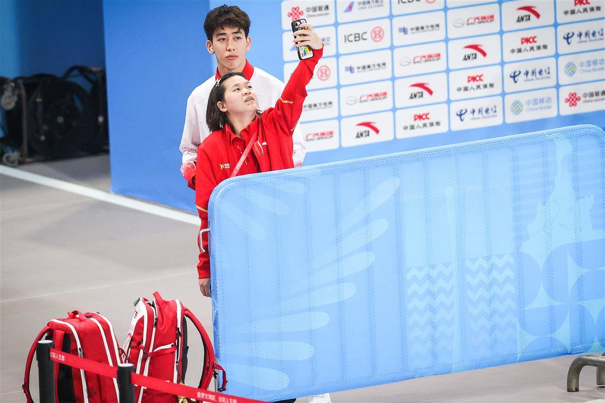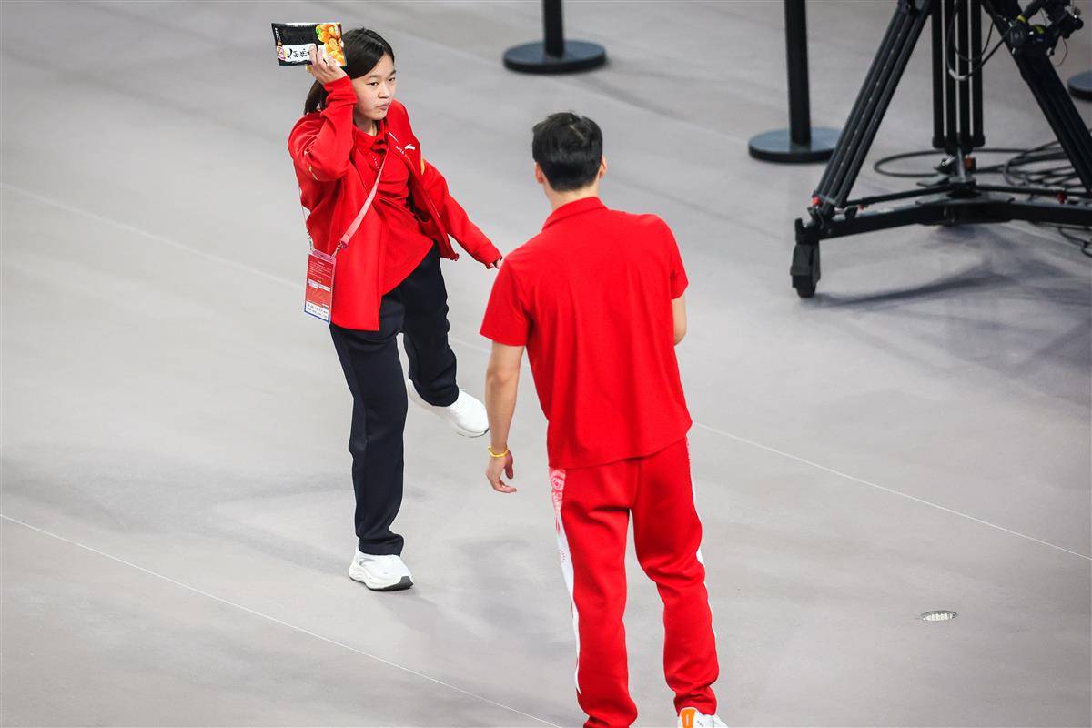 11月3日,当日没有比赛任务的全红婵来到广东奥体中心游泳馆,准备为晚上出战的广东男团加油。在场内,她再度化身“开心果”,吃着零食、拍照、与队友互动,开开心心再启“团宠”模式。(湖北日报全媒记者 时龚 摄)