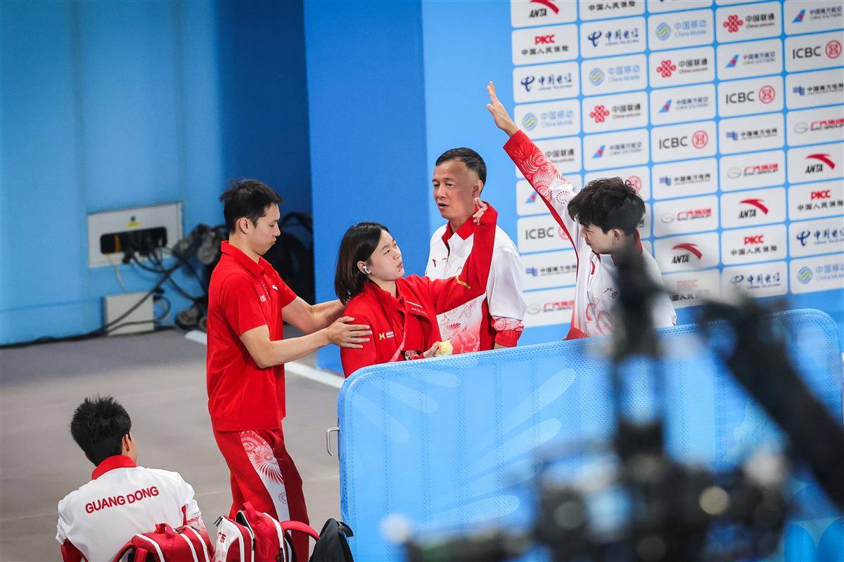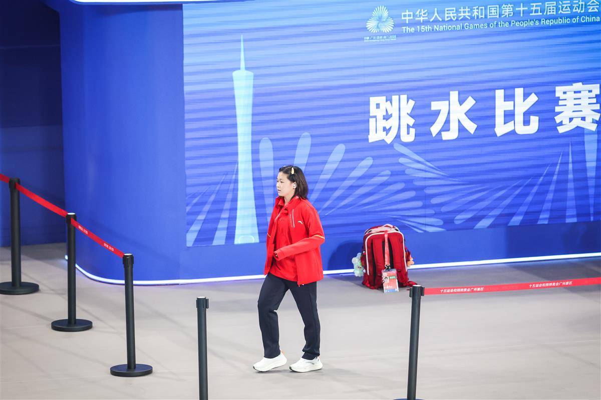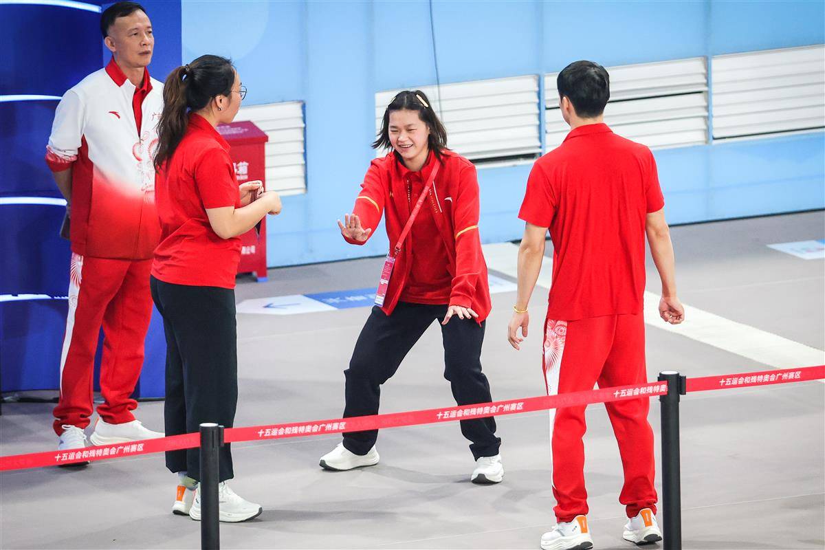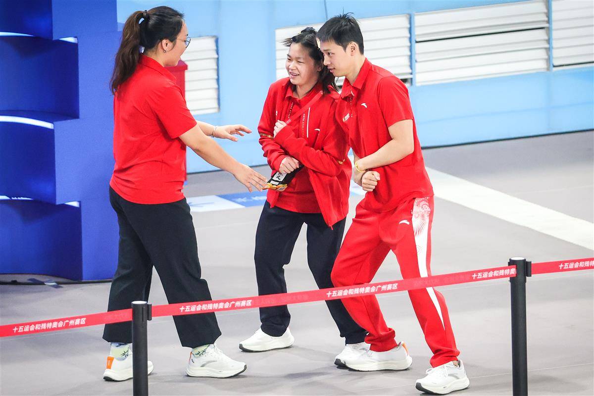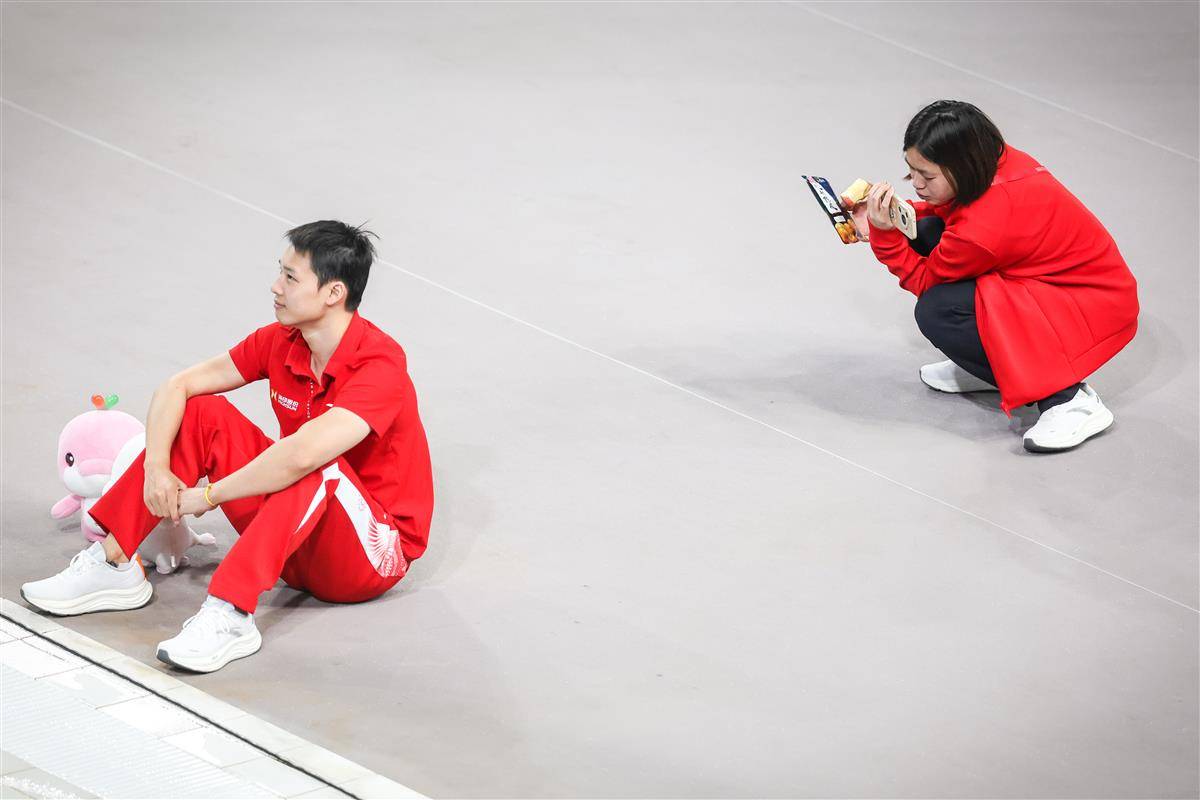 11月3日,当日没有比赛任务的全红婵来到广东奥体中心游泳馆,准备为晚上出战的广东男团加油。在场内,她再度化身“开心果”,吃着零食、拍照、与队友互动,开开心心再启“团宠”模式。(湖北日报全媒记者 时龚 摄)