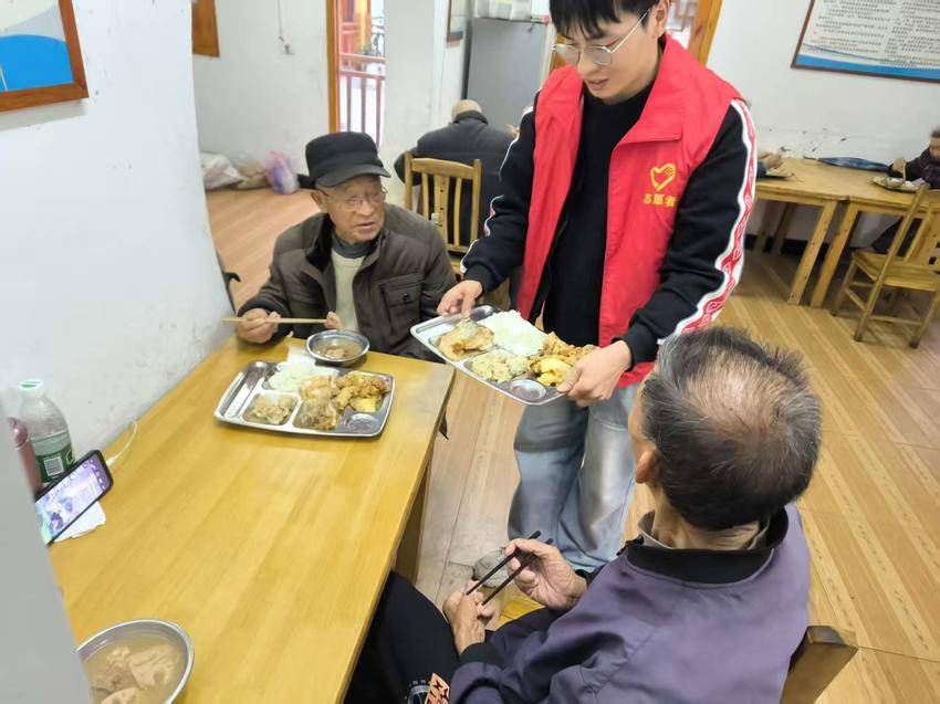 用餐时段,食堂供应的三菜一汤按人数精准烹饪,兼顾营养与节约。志愿者为牙口不好的老人添汤汁,老人们则主动提醒“少盛点,不够再添”;餐后,多位老人还起身协助收拾碗筷,查看是否有可留存食材,用行动践行节约。